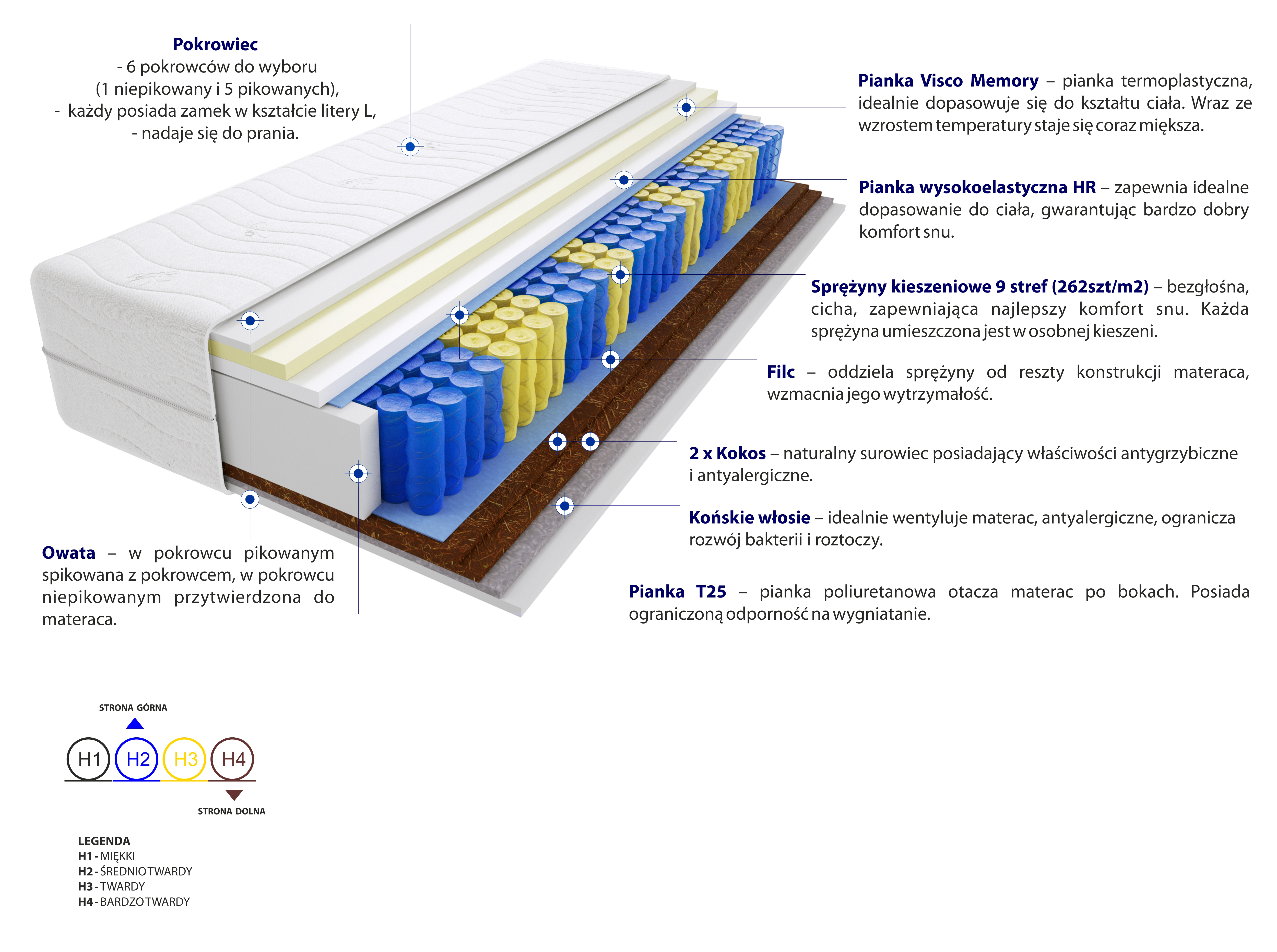 sprezyny-kieszeniowe, pianka-wysokoelastyczna-hr, pianka-visco-memory, 2x-kokos, konskie-wlosie, pianka-t25, pokrowiec, filc, wlokno-klimatyzujace