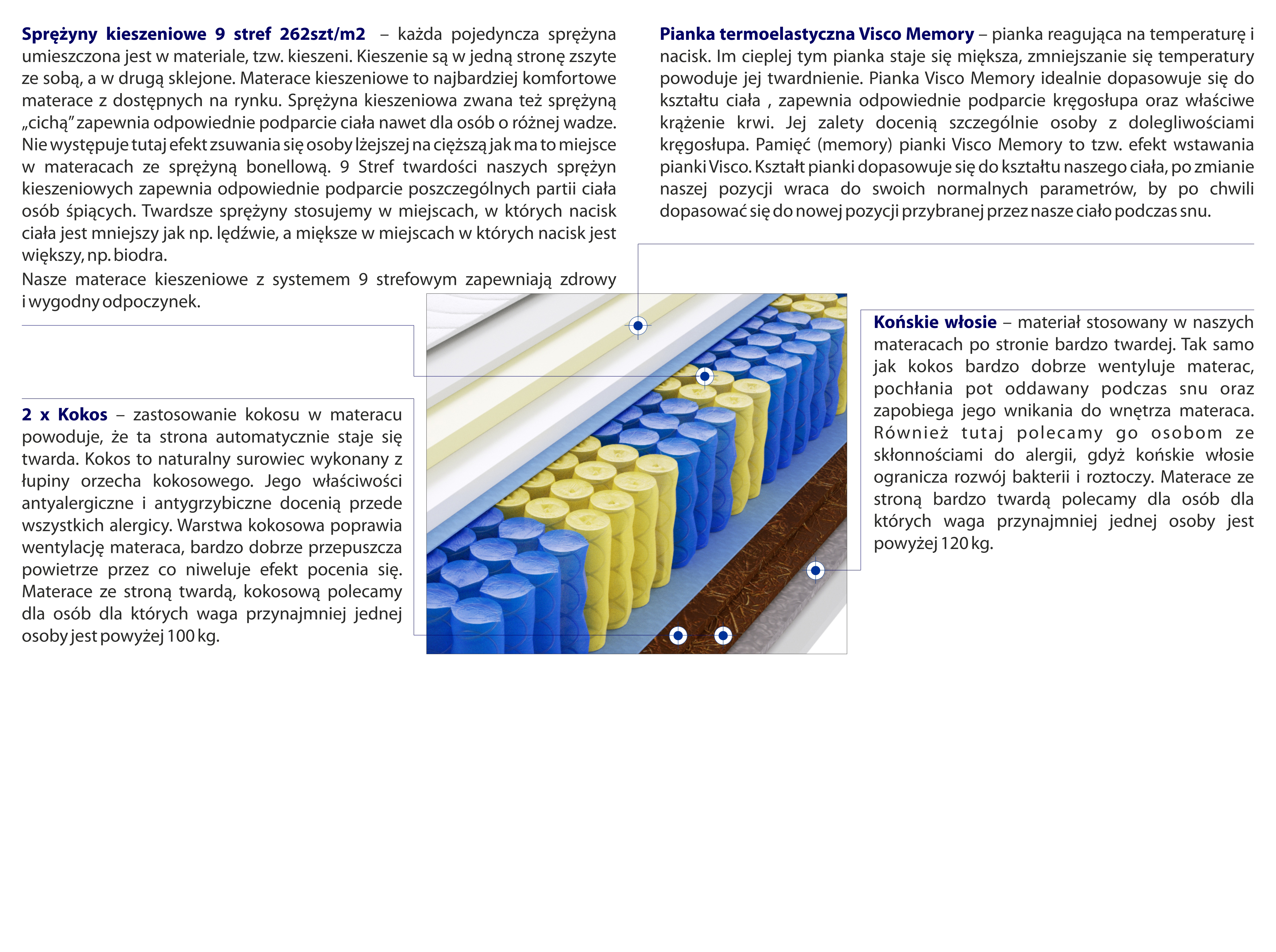 – każda pojedyncza sprężyna umieszczona jest w materiale, tzw. kieszeni. Kieszenie są w jedną stronę zszyte ze sobą, a w drugą sklejone. Materace kieszeniowe to najbardziej komfortowe materace z dostępnych na rynku. Sprężyna kieszeniowa zwana też sprężyną „cichą” zapewnia odpowiednie podparcie ciała nawet dla osób o różnej wadze. Nie występuje tutaj efekt zsuwania się osoby lżejszej na cięższą jak ma to miejsce w materacach ze sprężyną bonellową. 9 Stref twardości naszych sprężyn kieszeniowych zapewnia odpowiednie podparcie poszczególnych partii ciała osób śpiących. Twardsze sprężyny stosujemy w miejscach, w których nacisk ciała jest mniejszy jak np. lędźwie, a miększe w miejscach w których nacisk jest większy, np. biodra.