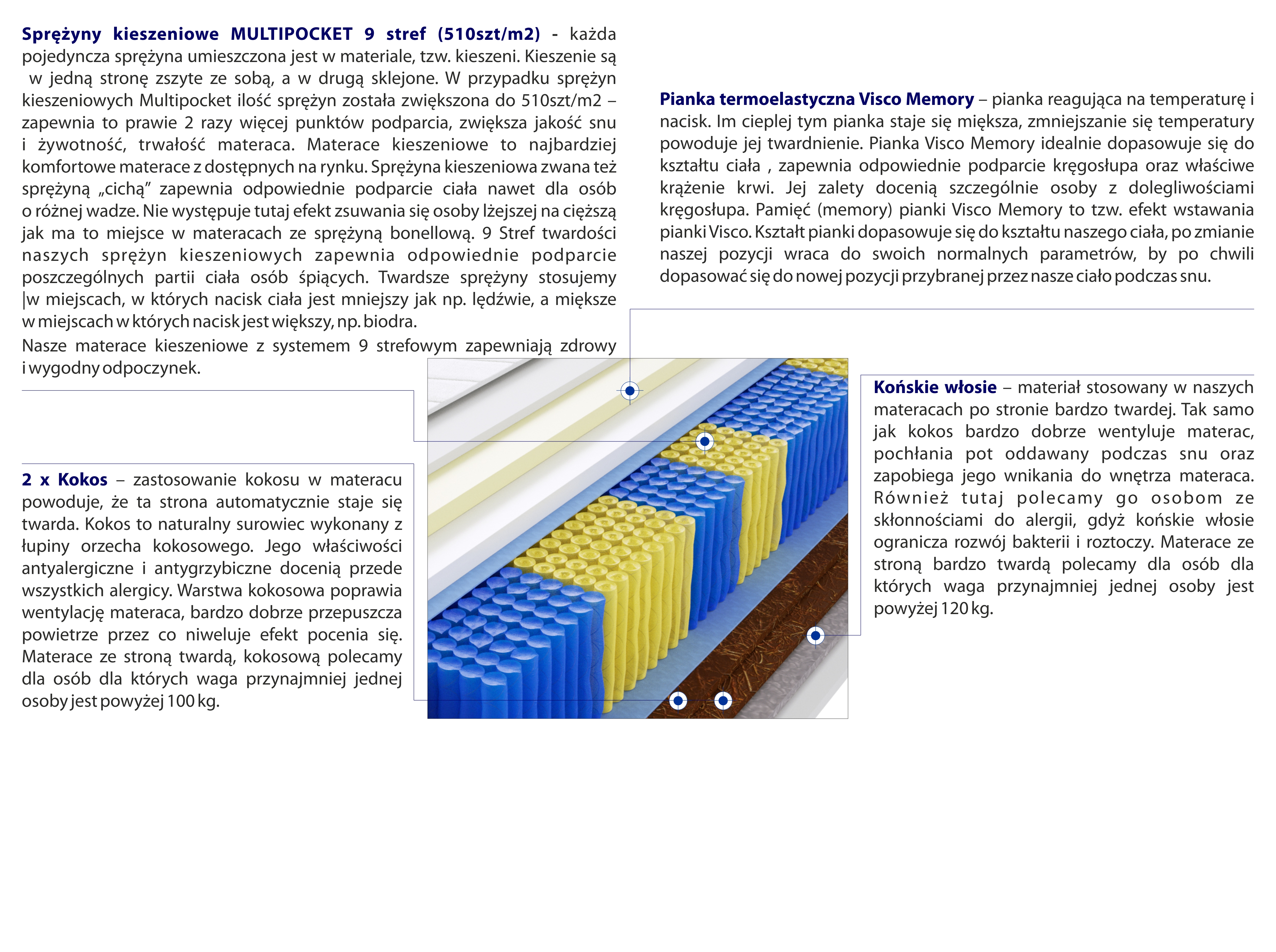 – każda pojedyncza sprężyna umieszczona jest w materiale, tzw. kieszeni. Kieszenie są w jedną stronę zszyte ze sobą, a w drugą sklejone. W przypadku sprężyn kieszeniowych Multipocket ilość sprężyn została zwiększona do 510szt/m2 – zapewnia to prawie 2 razy więcej punktów podparcia, zwiększa jakość snu i żywotność, trwałość materaca. Materace kieszeniowe to najbardziej komfortowe materace z dostępnych na rynku. Sprężyna kieszeniowa zwana też sprężyną „cichą” zapewnia odpowiednie podparcie ciała nawet dla osób o różnej wadze. Nie występuje tutaj efekt zsuwania się osoby lżejszej na cięższą jak ma to miejsce w materacach ze sprężyną bonellową. 9 Stref twardości naszych sprężyn kieszeniowych zapewnia odpowiednie podparcie poszczególnych partii ciała osób śpiących. Twardsze sprężyny stosujemy w miejscach, w których nacisk ciała jest mniejszy jak np. lędźwie, a miększe w miejscach w których nacisk jest większy, np. biodra.