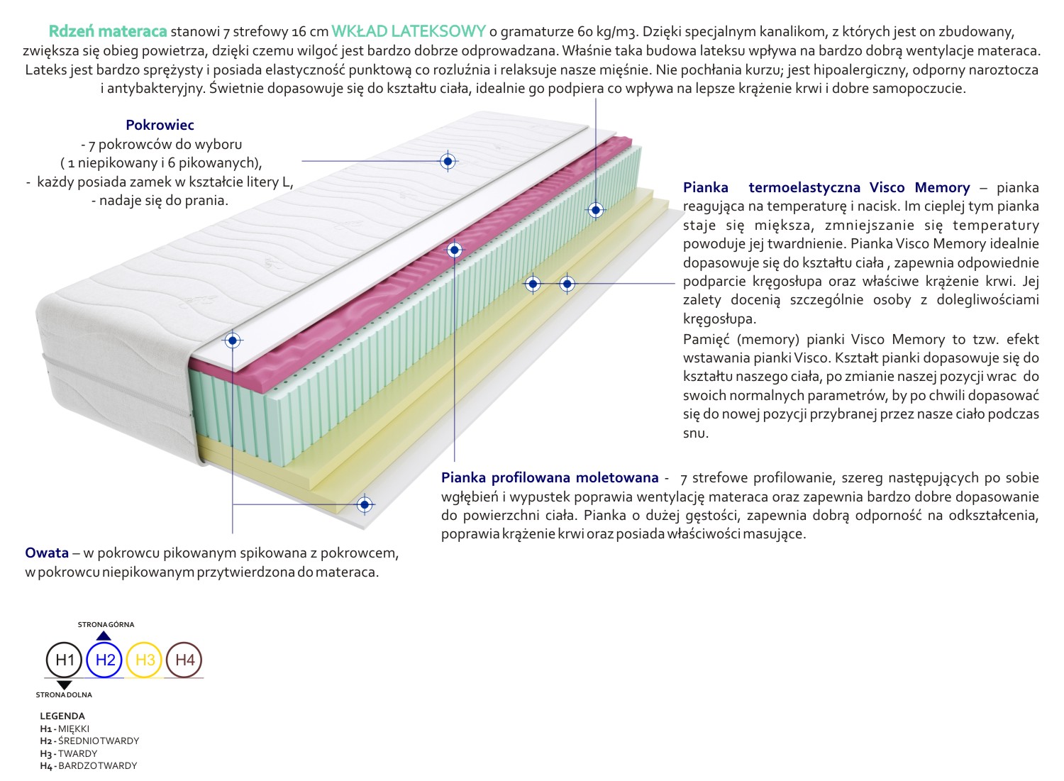 – rdzeniem materaca jest 7 strefowy wkład lateksowy o gramaturze 60 kg/m3 i wysokości 16 cm. Lateks zbudowany jest ze specjalnych mikrokanalików, które zwiększają obieg powietrza i bardzo dobrze odprowadzają wilgoć. Specyficzna budowa lateksu to jego przewaga nad innych surowcami, bardzo dobrze wentyluje on materac. Lateks posiada elastyczność punktową i jest bardzo sprężysty. Nie zapadamy się w nim, rozluźnia on i relaksuje nasze ciało. Z drugiej strony nie pochłania on kurzu, jest antybakteryjny, hypoalergiczny i odporny na roztocza. Materace z rdzeniem lateksowym idealnie dopasowują się do kształtu ciała, bardzo dobrze go podpierają, zapewniając dobre samopoczucie i lepsze krążenie krwi.