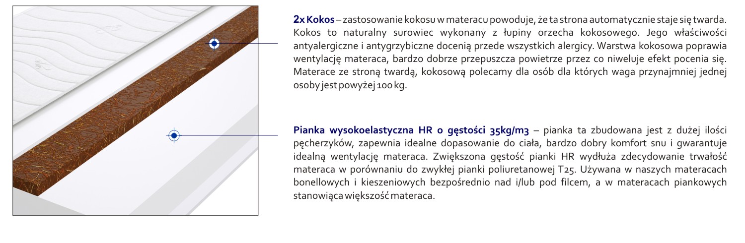 – zastosowanie kokosu w materacu powoduje, że ta strona automatycznie staje się twarda. Kokos to naturalny surowiec wykonany z łupiny orzecha kokosowego. Jego właściwości antyalergiczne i antygrzybiczne docenią przede wszystkich alergicy. Warstwa kokosowa poprawia wentylację materaca, bardzo dobrze przepuszcza powietrze przez co niweluje efekt pocenia się.