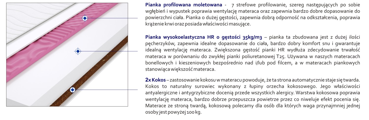 2x Kokos, Pianka profilowana molet, Pianka wysokoelastyczna HR, Pokrowiec, Włókno klimatyzujące