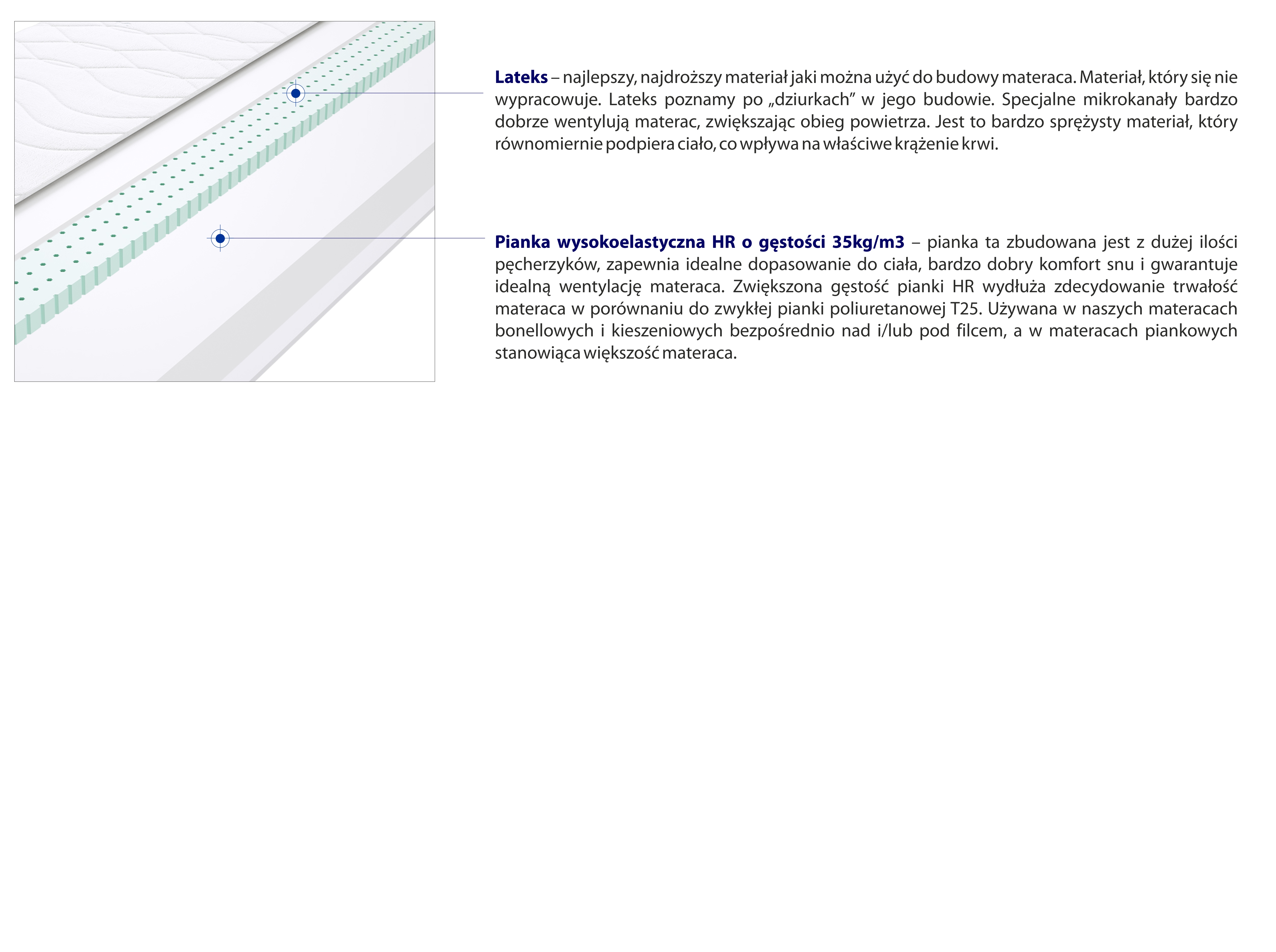 o gęstości 35kg/m3 – pianka ta zbudowana jest z dużej ilości pęcherzyków, zapewnia idealne dopasowanie do ciała, bardzo dobry komfort snu i gwarantuje idealną wentylację materaca. Zwiększona gęstość pianki HR wydłuża zdecydowanie trwałość materaca w porównaniu do zwykłej pianki poliuretanowej T25. Używana w naszych materacach bonellowych i kieszeniowych bezpośrednio nad i/lub pod filcem, a w materacach piankowych stanowiąca większość materaca.