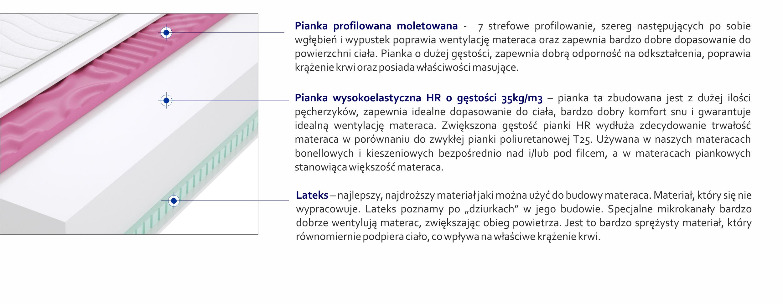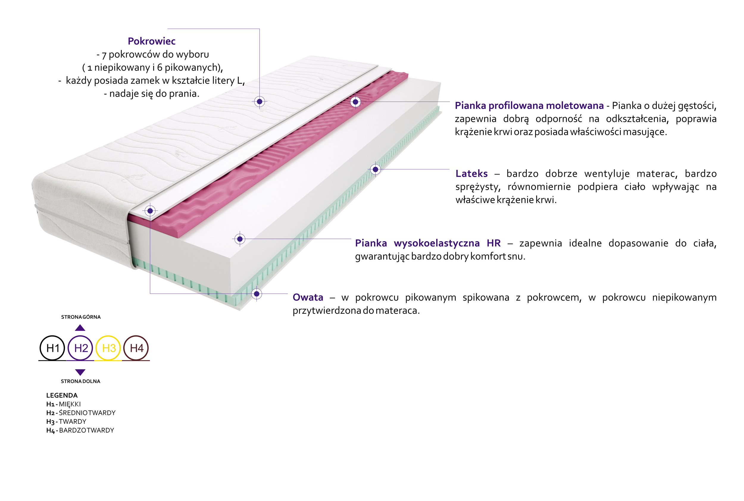 Lateks, Pianka profilowana molet, Pianka wysokoelastyczna HR, Pokrowiec, Włókno klimatyzujące