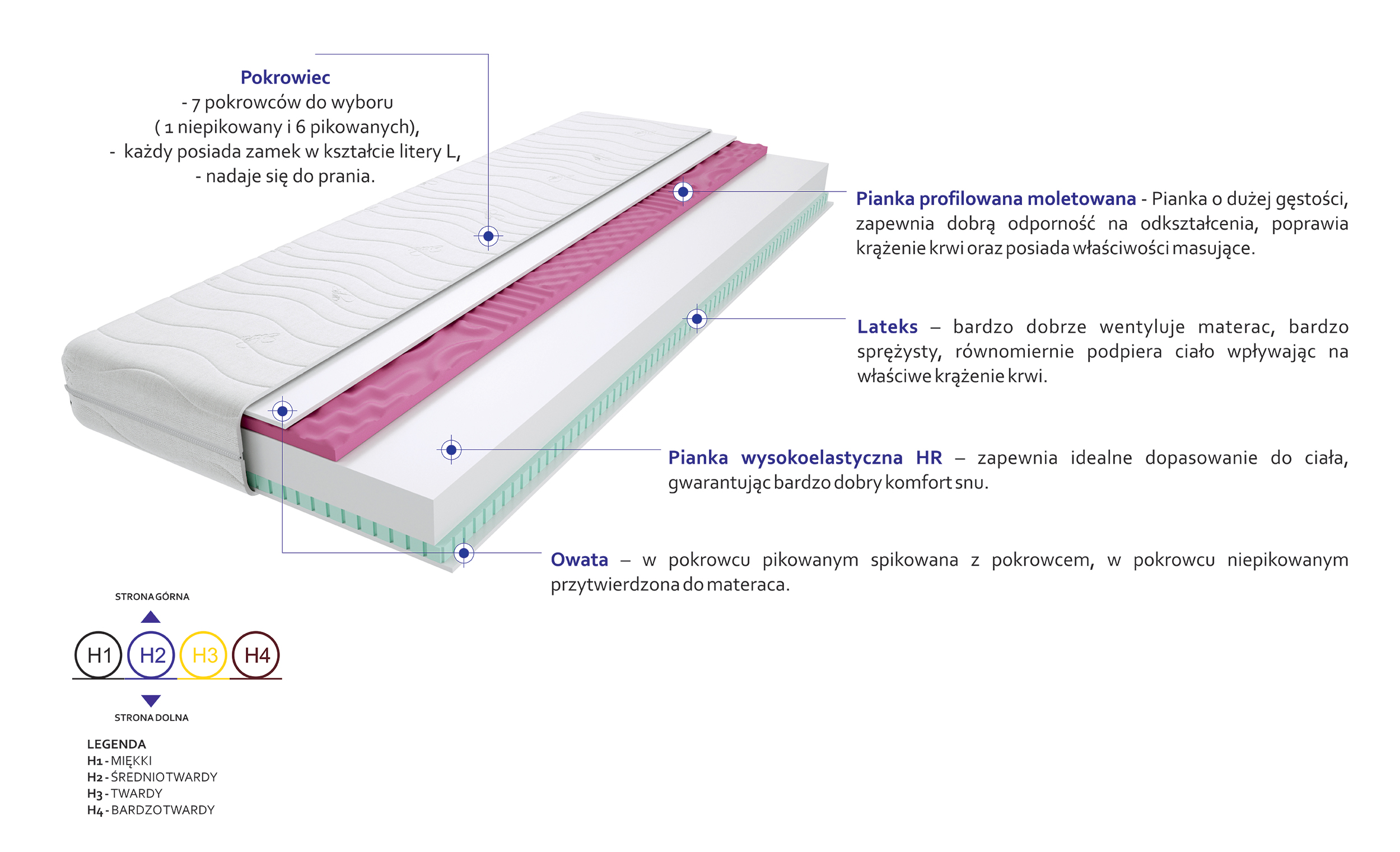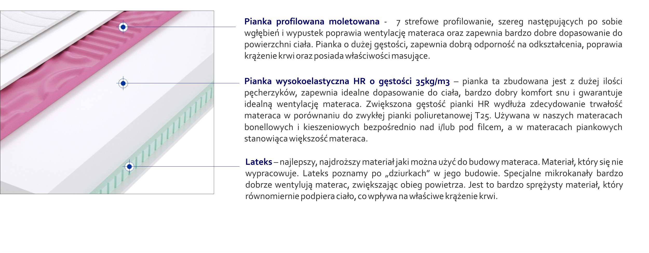 Lateks, Pianka profilowana molet, Pianka wysokoelastyczna HR, Pokrowiec, Włókno klimatyzujące