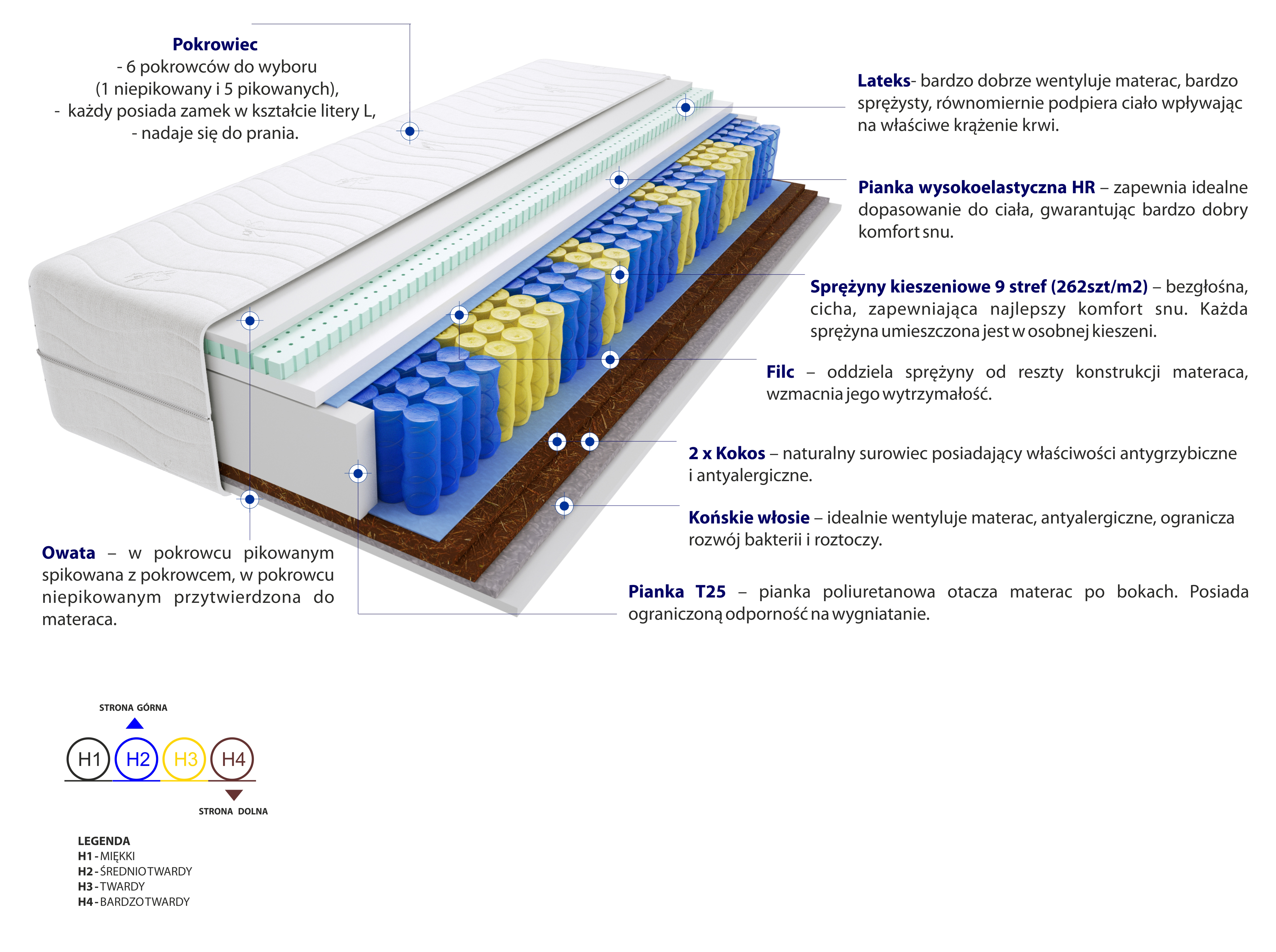 2x Kokos, Filc, Końskie Włosie, Lateks, Pianka T25, Pianka wysokoelastyczna HR, Pokrowiec, Sprężyny kieszeniowe, Włókno klimatyzujące
