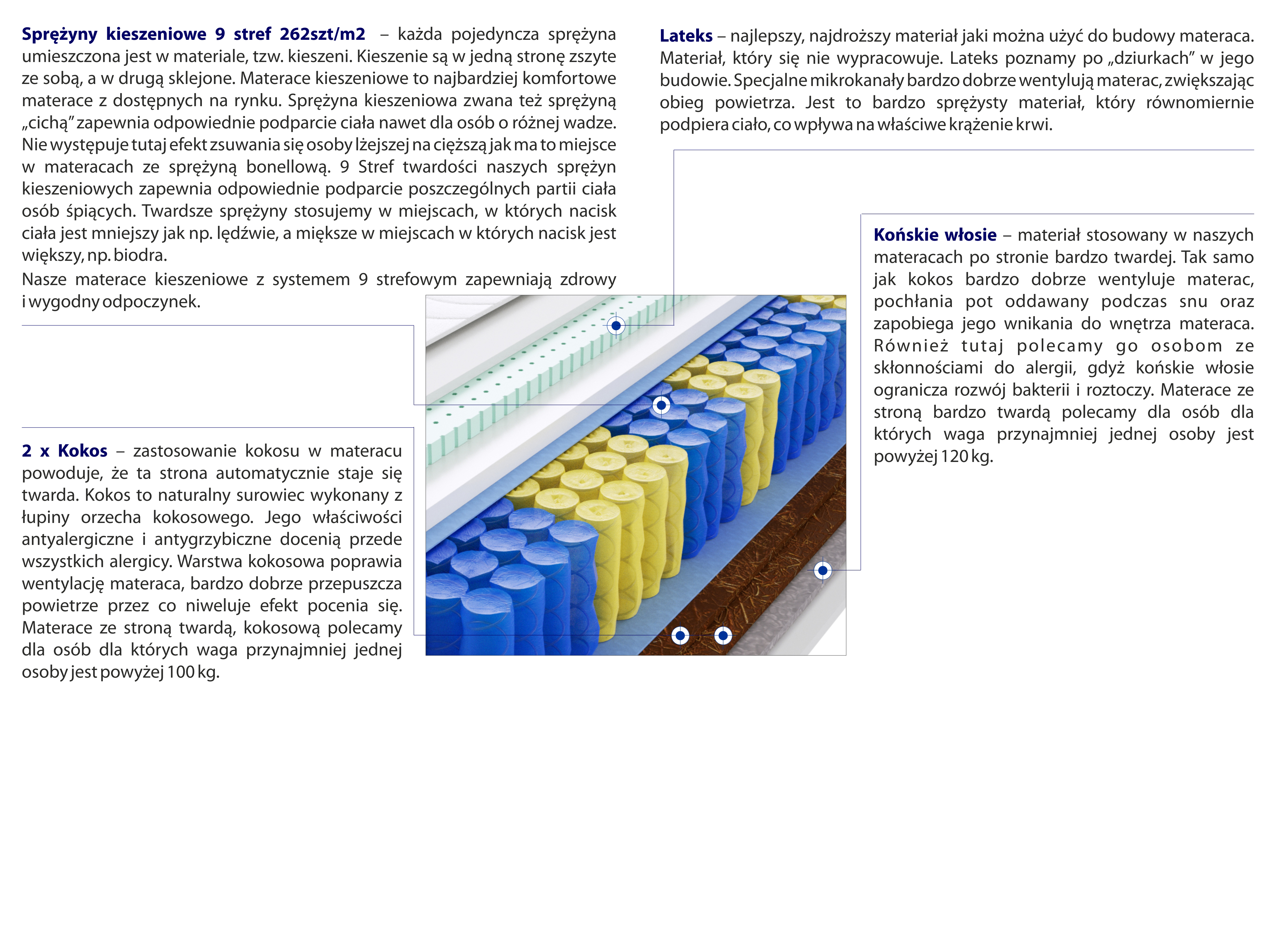 – każda pojedyncza sprężyna umieszczona jest w materiale, tzw. kieszeni. Kieszenie są w jedną stronę zszyte ze sobą, a w drugą sklejone. Materace kieszeniowe to najbardziej komfortowe materace z dostępnych na rynku. Sprężyna kieszeniowa zwana też sprężyną „cichą” zapewnia odpowiednie podparcie ciała nawet dla osób o różnej wadze. Nie występuje tutaj efekt zsuwania się osoby lżejszej na cięższą jak ma to miejsce w materacach ze sprężyną bonellową. 9 Stref twardości naszych sprężyn kieszeniowych zapewnia odpowiednie podparcie poszczególnych partii ciała osób śpiących. Twardsze sprężyny stosujemy w miejscach, w których nacisk ciała jest mniejszy jak np. lędźwie, a miększe w miejscach w których nacisk jest większy, np. biodra.