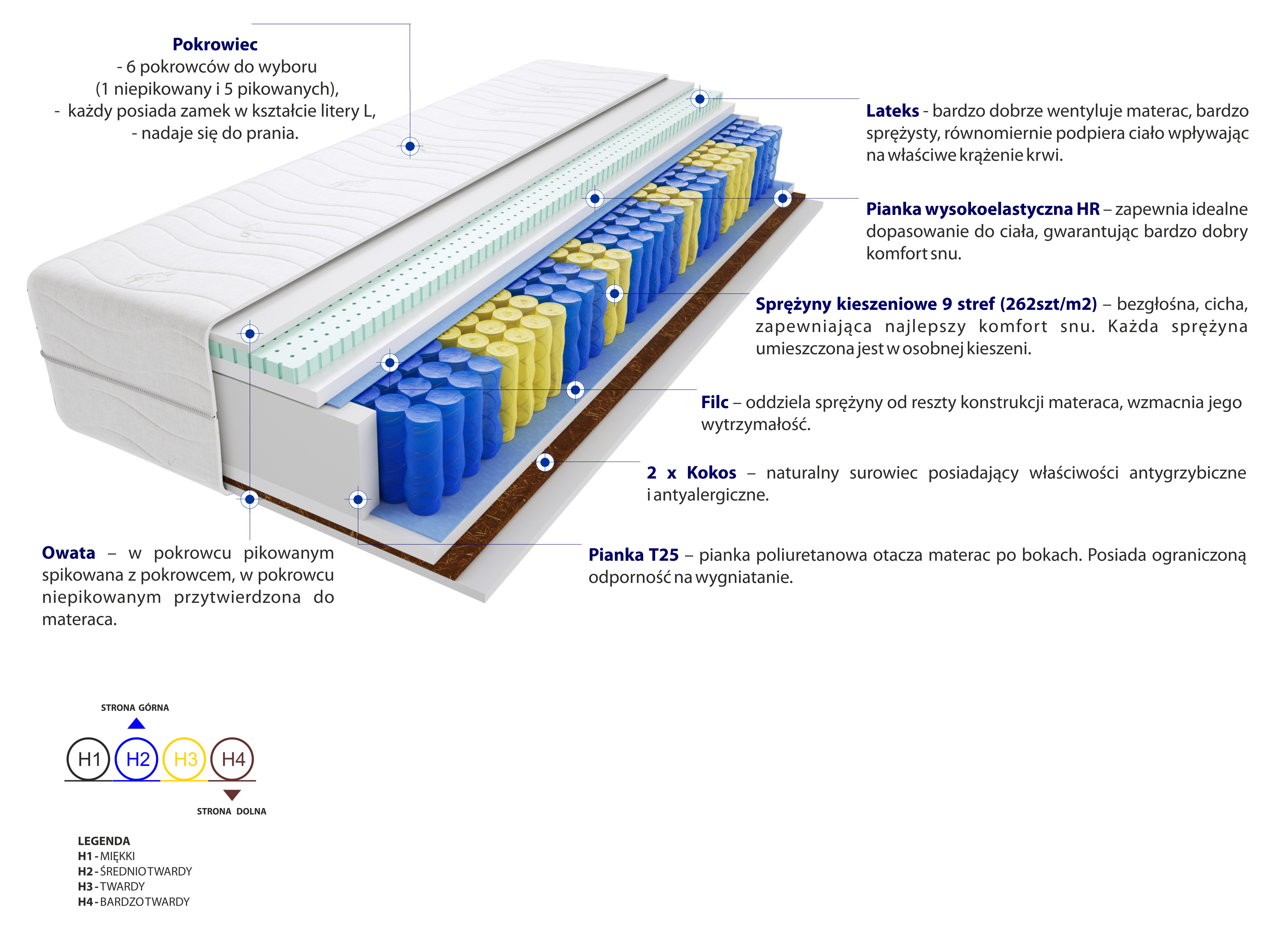 2x Kokos, Filc, Lateks, Pianka T25, Pianka wysokoelastyczna HR, Pokrowiec, Sprężyny kieszeniowe, Włókno klimatyzujące