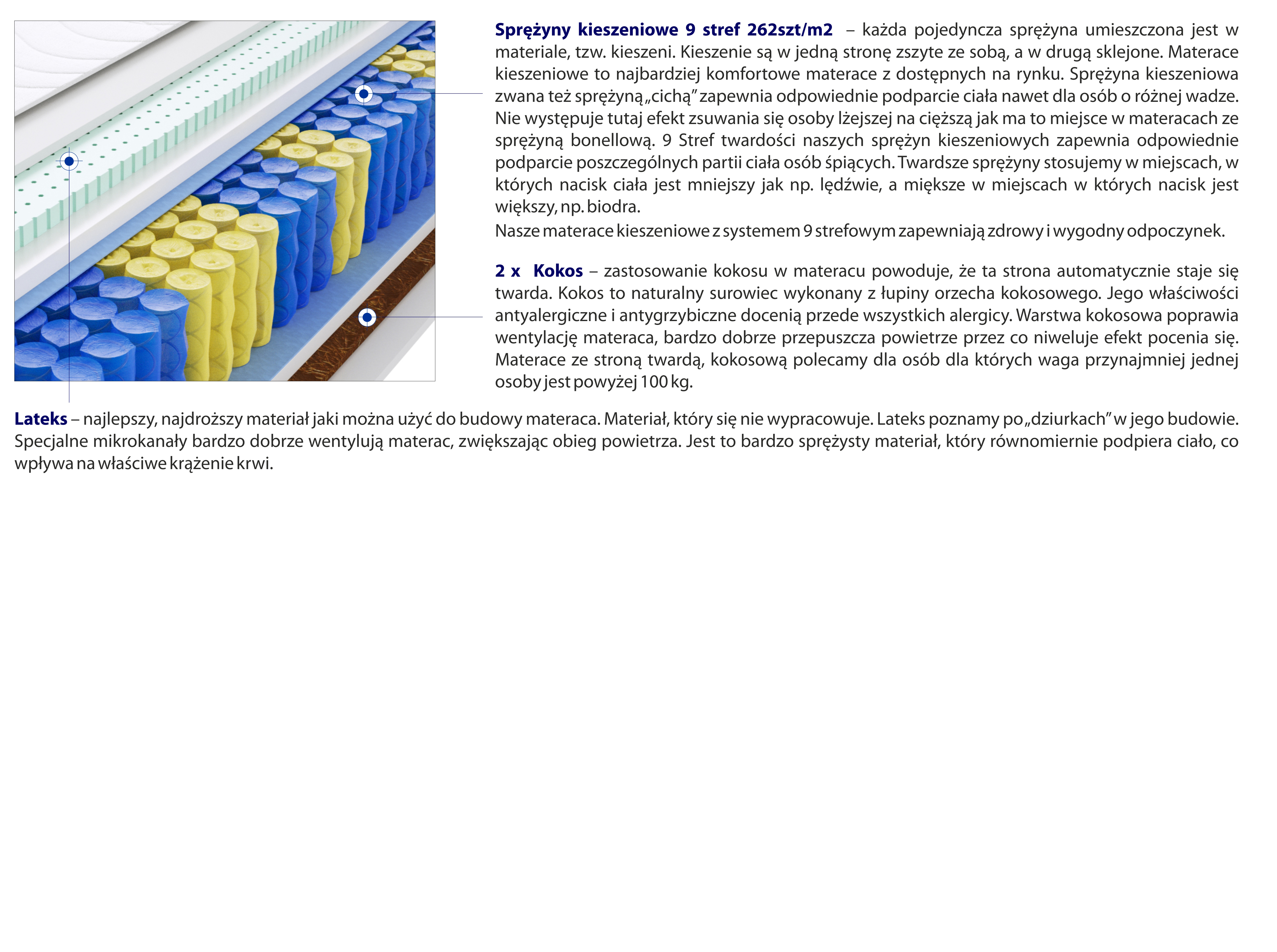 – każda pojedyncza sprężyna umieszczona jest w materiale, tzw. kieszeni. Kieszenie są w jedną stronę zszyte ze sobą, a w drugą sklejone. Materace kieszeniowe to najbardziej komfortowe materace z dostępnych na rynku. Sprężyna kieszeniowa zwana też sprężyną „cichą” zapewnia odpowiednie podparcie ciała nawet dla osób o różnej wadze. Nie występuje tutaj efekt zsuwania się osoby lżejszej na cięższą jak ma to miejsce w materacach ze sprężyną bonellową. 9 Stref twardości naszych sprężyn kieszeniowych zapewnia odpowiednie podparcie poszczególnych partii ciała osób śpiących. Twardsze sprężyny stosujemy w miejscach, w których nacisk ciała jest mniejszy jak np. lędźwie, a miększe w miejscach w których nacisk jest większy, np. biodra.