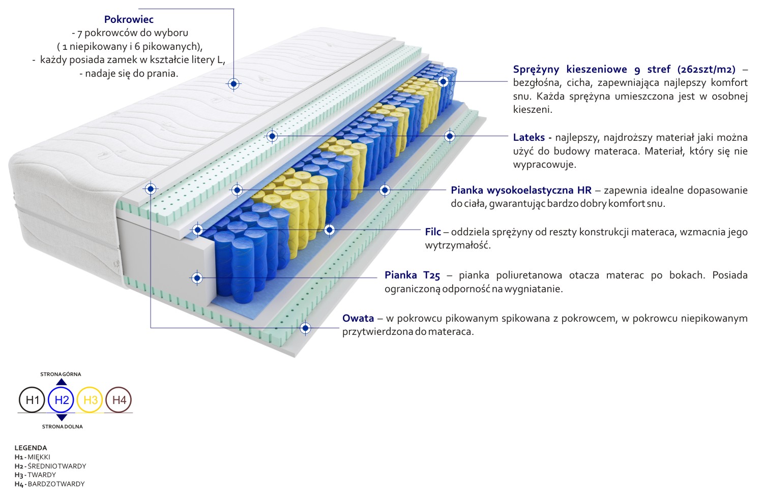 – każda pojedyncza sprężyna umieszczona jest w materiale, tzw. kieszeni. Kieszenie są w jedną stronę zszyte ze sobą, a w drugą sklejone. Materace kieszeniowe to najbardziej komfortowe materace z dostępnych na rynku. Sprężyna kieszeniowa zwana też sprężyną „cichą” zapewnia odpowiednie podparcie ciała nawet dla osób o różnej wadze. Nie występuje tutaj efekt zsuwania się osoby lżejszej na cięższą jak ma to miejsce w materacach ze sprężyną bonellową. 9 Stref twardości naszych sprężyn kieszeniowych zapewnia odpowiednie podparcie poszczególnych partii ciała osób śpiących. Twardsze sprężyny stosujemy w miejscach, w których nacisk ciała jest mniejszy jak np. lędźwie, a miększe w miejscach w których nacisk jest większy, np. biodra.