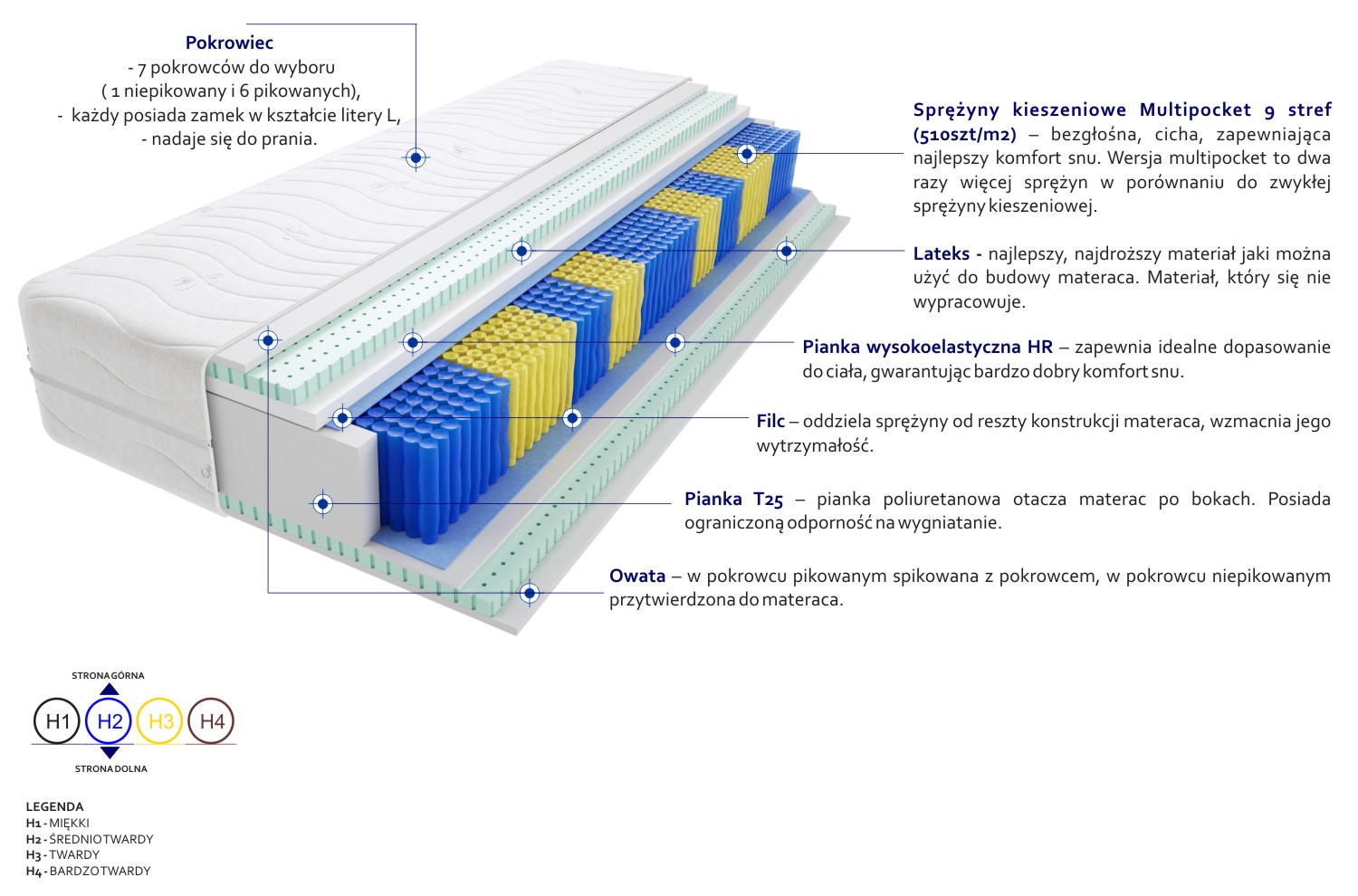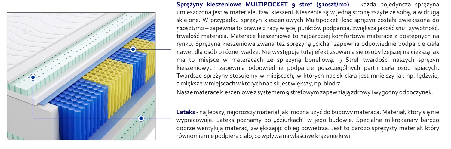 – każda pojedyncza sprężyna umieszczona jest w materiale, tzw. kieszeni. Kieszenie są w jedną stronę zszyte ze sobą, a w drugą sklejone. W przypadku sprężyn kieszeniowych Multipocket ilość sprężyn została zwiększona do 510szt/m2 – zapewnia to prawie 2 razy więcej punktów podparcia, zwiększa jakość snu i żywotność, trwałość materaca. Materace kieszeniowe to najbardziej komfortowe materace z dostępnych na rynku. Sprężyna kieszeniowa zwana też sprężyną „cichą” zapewnia odpowiednie podparcie ciała nawet dla osób o różnej wadze. Nie występuje tutaj efekt zsuwania się osoby lżejszej na cięższą jak ma to miejsce w materacach ze sprężyną bonellową. 9 Stref twardości naszych sprężyn kieszeniowych zapewnia odpowiednie podparcie poszczególnych partii ciała osób śpiących. Twardsze sprężyny stosujemy w miejscach, w których nacisk ciała jest mniejszy jak np. lędźwie, a miększe w miejscach w których nacisk jest większy, np. biodra.