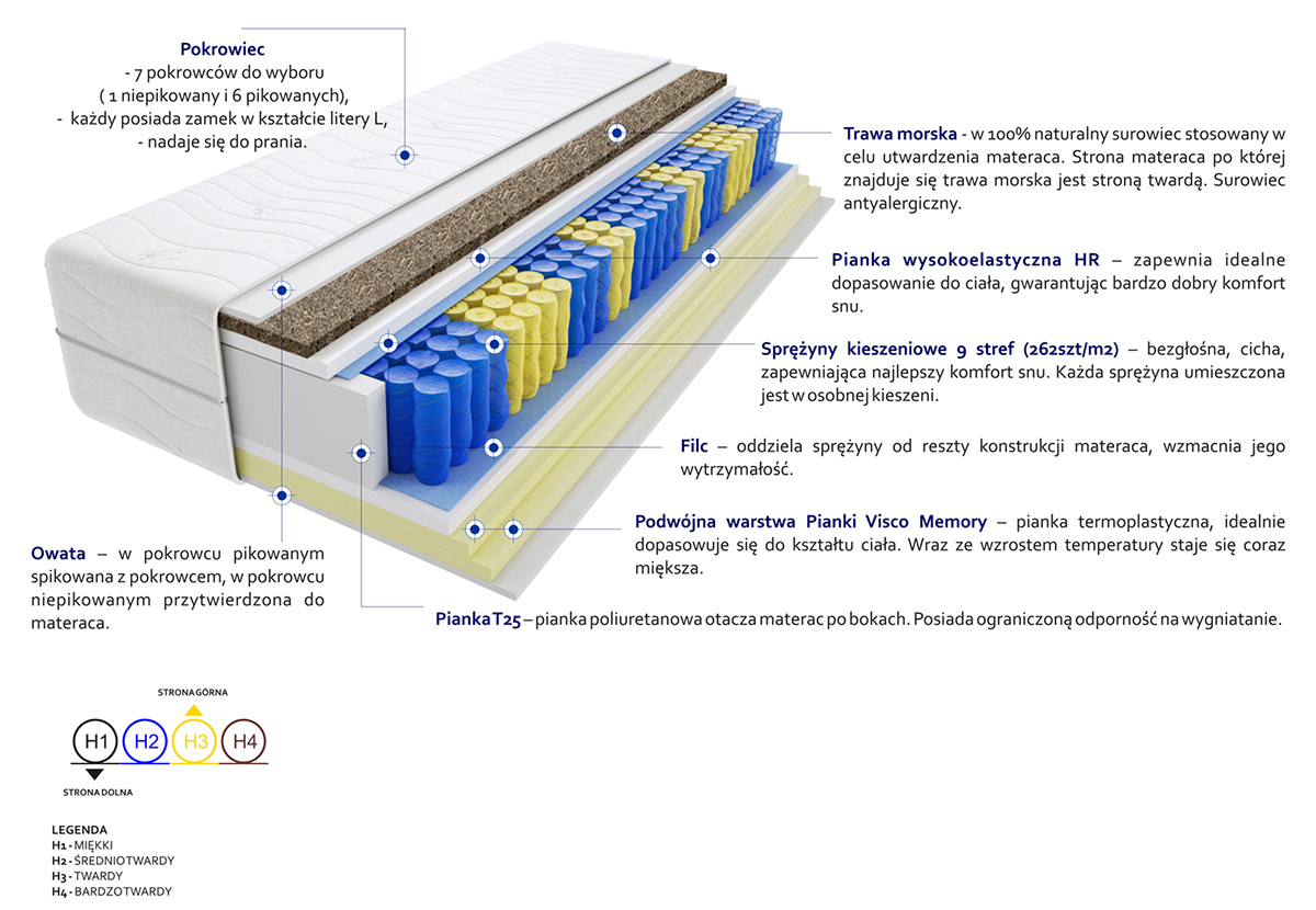 2x Pianka Visco Memory, Filc, Pianka T25, Pianka wysokoelastyczna HR, Pokrowiec, Sprężyny kieszeniowe, Trawa morska, Włókno klimatyzujące