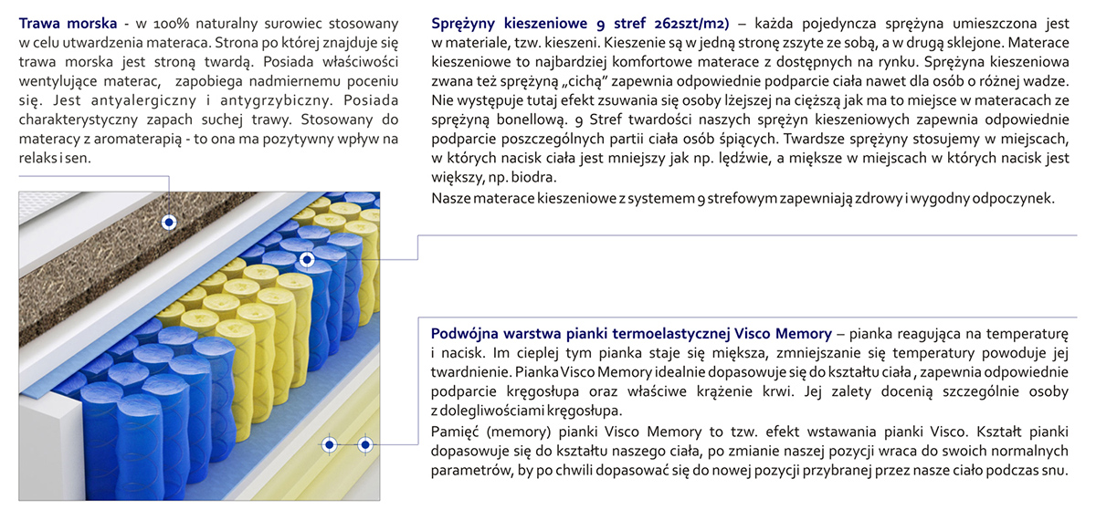 – każda pojedyncza sprężyna umieszczona jest w materiale, tzw. kieszeni. Kieszenie są w jedną stronę zszyte ze sobą, a w drugą sklejone. Materace kieszeniowe to najbardziej komfortowe materace z dostępnych na rynku. Sprężyna kieszeniowa zwana też sprężyną „cichą” zapewnia odpowiednie podparcie ciała nawet dla osób o różnej wadze. Nie występuje tutaj efekt zsuwania się osoby lżejszej na cięższą jak ma to miejsce w materacach ze sprężyną bonellową. 9 Stref twardości naszych sprężyn kieszeniowych zapewnia odpowiednie podparcie poszczególnych partii ciała osób śpiących. Twardsze sprężyny stosujemy w miejscach, w których nacisk ciała jest mniejszy jak np. lędźwie, a miększe w miejscach w których nacisk jest większy, np. biodra. Nasze materace kieszeniowe z systemem 9 strefowym zapewniają zdrowy i wygodny odpoczynek.