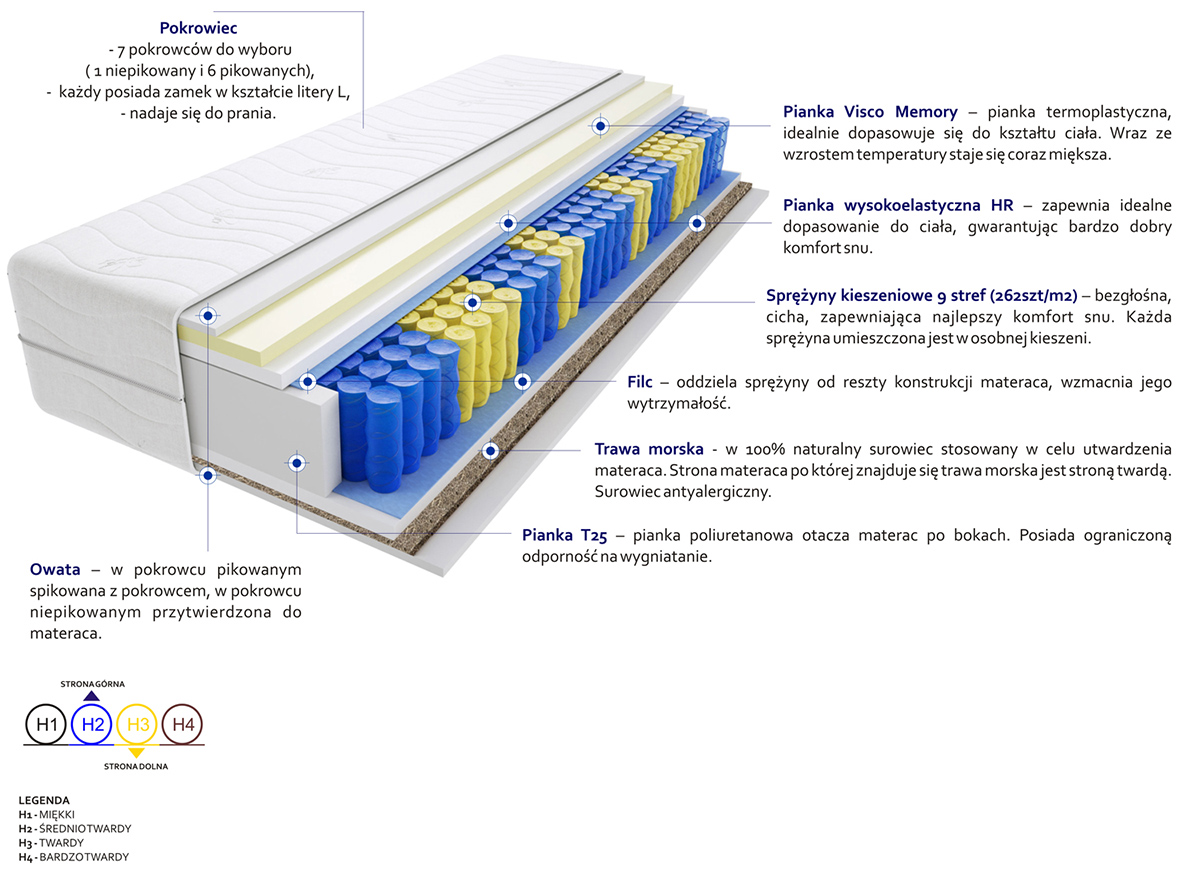 Filc, Pianka T25, Pianka Visco Memory, Pianka wysokoelastyczna HR, Pokrowiec, Sprężyny kieszeniowe, Trawa morska, Włókno klimatyzujące