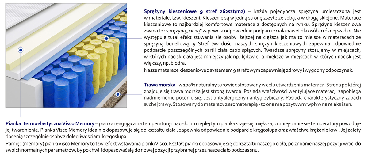 – każda pojedyncza sprężyna umieszczona jest w materiale, tzw. kieszeni. Kieszenie są w jedną stronę zszyte ze sobą, a w drugą sklejone. Materace kieszeniowe to najbardziej komfortowe materace z dostępnych na rynku. Sprężyna kieszeniowa zwana też sprężyną „cichą” zapewnia odpowiednie podparcie ciała nawet dla osób o różnej wadze. Nie występuje tutaj efekt zsuwania się osoby lżejszej na cięższą jak ma to miejsce w materacach ze sprężyną bonellową. 9 Stref twardości naszych sprężyn kieszeniowych zapewnia odpowiednie podparcie poszczególnych partii ciała osób śpiących. Twardsze sprężyny stosujemy w miejscach, w których nacisk ciała jest mniejszy jak np. lędźwie, a miększe w miejscach w których nacisk jest większy, np. biodra.