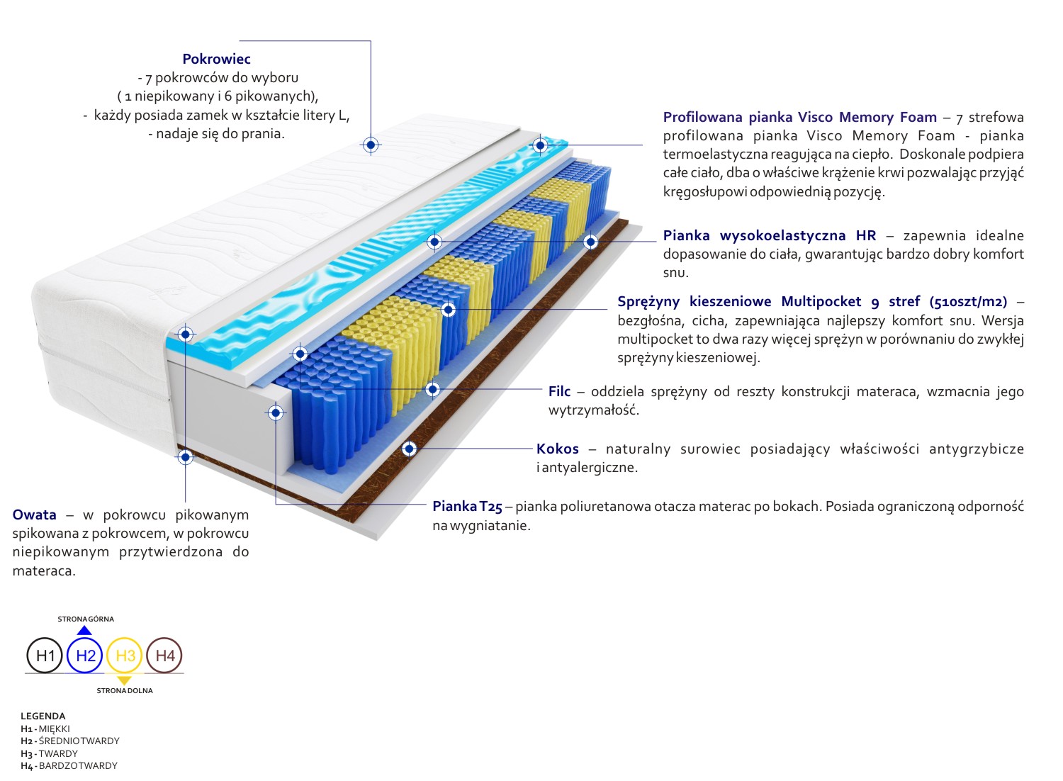 Filc, Kokos, Pianka profilowana Visco Memory, Pianka T25, Pianka wysokoelastyczna HR, Pokrowiec, Sprężyny kieszeniowe Multipocket, Włókno klimatyzujące