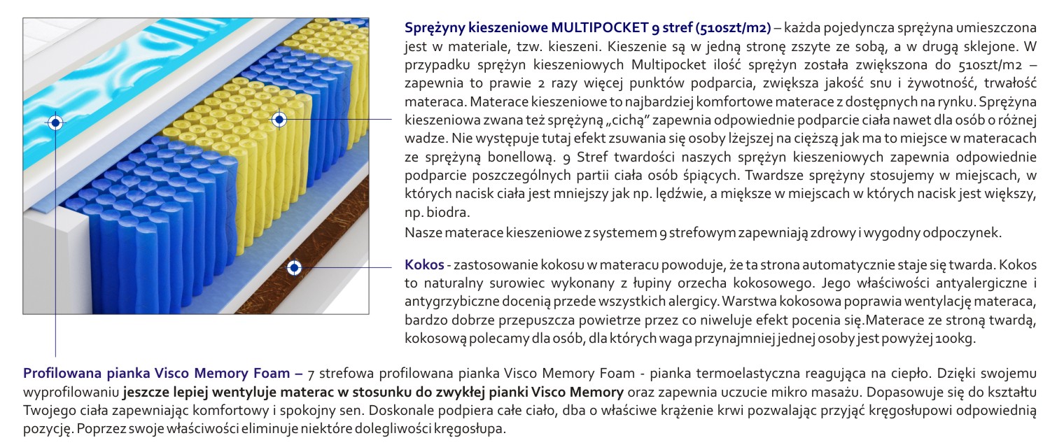 – każda pojedyncza sprężyna umieszczona jest w materiale, tzw. kieszeni. Kieszenie są w jedną stronę zszyte ze sobą, a w drugą sklejone. W przypadku sprężyn kieszeniowych Multipocket ilość sprężyn została zwiększona do 510szt/m2 – zapewnia to prawie 2 razy więcej punktów podparcia, zwiększa jakość snu i żywotność, trwałość materaca. Materace kieszeniowe to najbardziej komfortowe materace z dostępnych na rynku. Sprężyna kieszeniowa zwana też sprężyną „cichą” zapewnia odpowiednie podparcie ciała nawet dla osób o różnej wadze. Nie występuje tutaj efekt zsuwania się osoby lżejszej na cięższą jak ma to miejsce w materacach ze sprężyną bonellową. 9 Stref twardości naszych sprężyn kieszeniowych zapewnia odpowiednie podparcie poszczególnych partii ciała osób śpiących. Twardsze sprężyny stosujemy w miejscach, w których nacisk ciała jest mniejszy jak np. lędźwie, a miększe w miejscach w których nacisk jest większy, np. biodra. Nasze materace kieszeniowe z systemem 9 strefowym zapewniają zdrowy i wygodny odpoczynek.