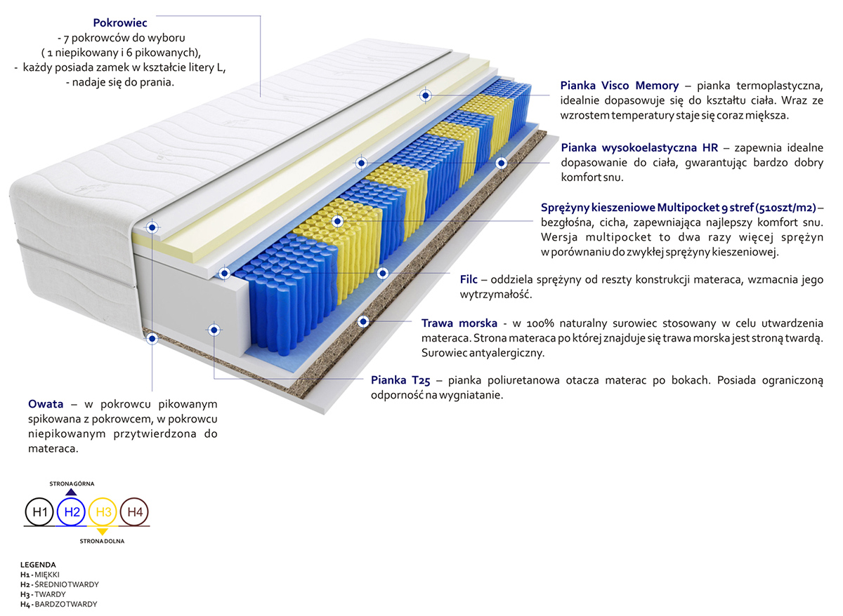 Filc, Pianka T25, Pianka Visco Memory, Pianka wysokoelastyczna HR, Pokrowiec, Sprężyny kieszeniowe Multipocket, Trawa morska, Włókno klimatyzujące