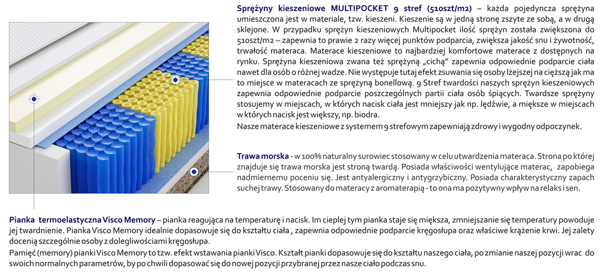 – każda pojedyncza sprężyna umieszczona jest w materiale, tzw. kieszeni. Kieszenie są w jedną stronę zszyte ze sobą, a w drugą sklejone. W przypadku sprężyn kieszeniowych Multipocket ilość sprężyn została zwiększona do 510szt/m2 – zapewnia to prawie 2 razy więcej punktów podparcia, zwiększa jakość snu i żywotność, trwałość materaca. Materace kieszeniowe to najbardziej komfortowe materace z dostępnych na rynku. Sprężyna kieszeniowa zwana też sprężyną „cichą” zapewnia odpowiednie podparcie ciała nawet dla osób o różnej wadze. Nie występuje tutaj efekt zsuwania się osoby lżejszej na cięższą jak ma to miejsce w materacach ze sprężyną bonellową. 9 Stref twardości naszych sprężyn kieszeniowych zapewnia odpowiednie podparcie poszczególnych partii ciała osób śpiących. Twardsze sprężyny stosujemy w miejscach, w których nacisk ciała jest mniejszy jak np. lędźwie, a miększe w miejscach w których nacisk jest większy, np. biodra.