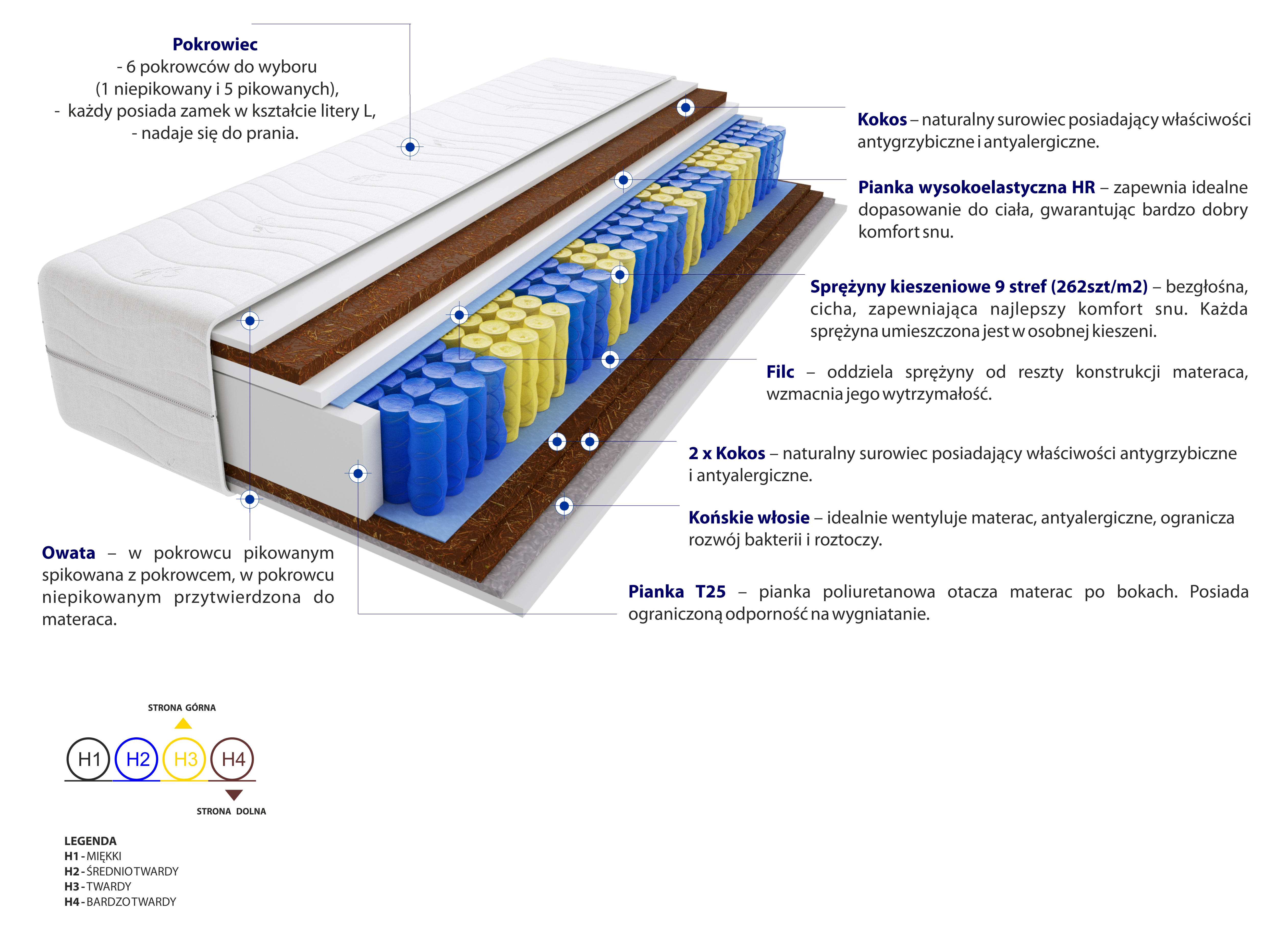 2x Kokos, Filc, Kokos, Końskie Włosie, Pianka T25, Pianka wysokoelastyczna HR, Pokrowiec, Sprężyny kieszeniowe Multipocket, Włókno klimatyzujące