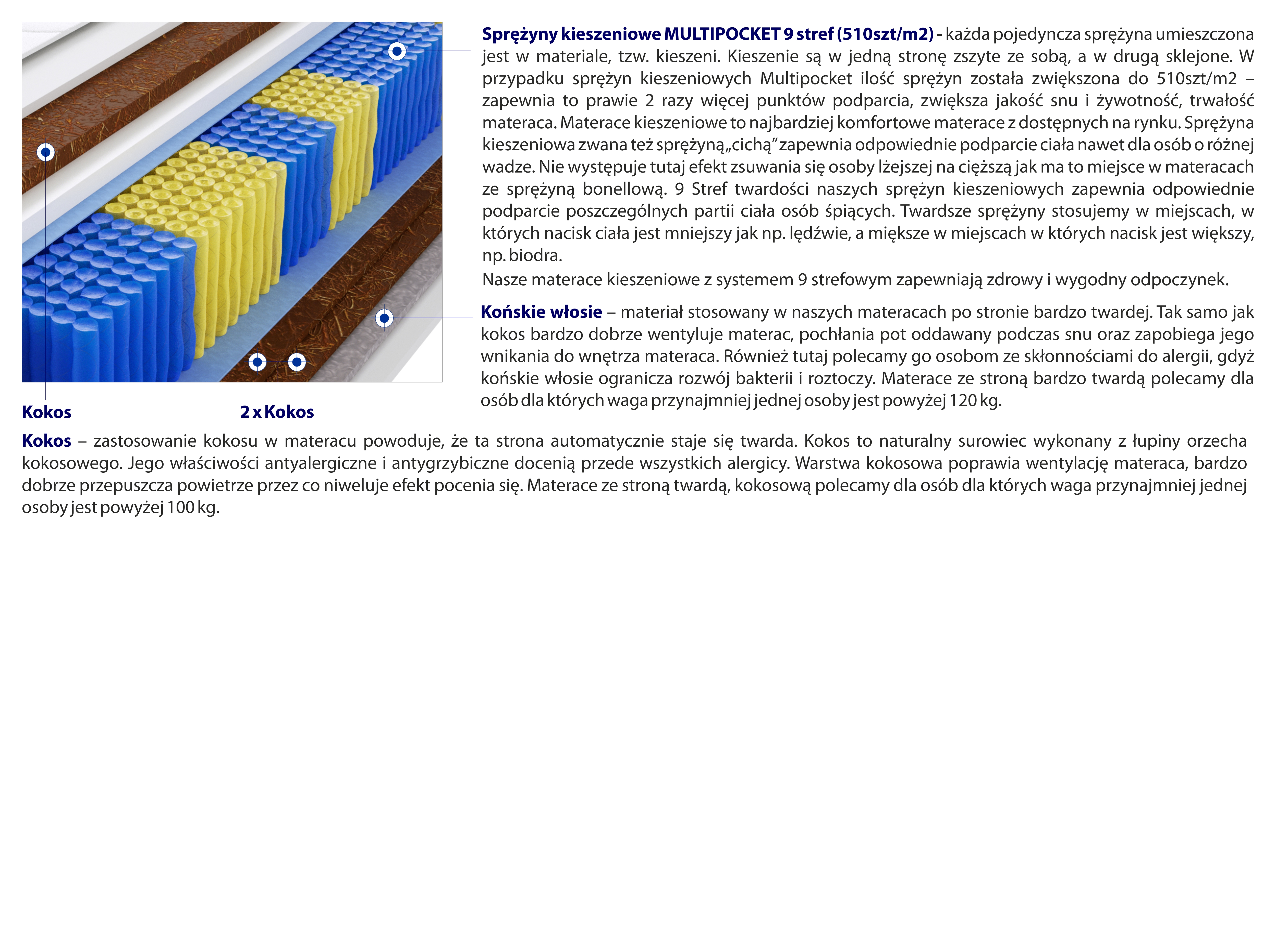 – każda pojedyncza sprężyna umieszczona jest w materiale, tzw. kieszeni. Kieszenie są w jedną stronę zszyte ze sobą, a w drugą sklejone. W przypadku sprężyn kieszeniowych Multipocket ilość sprężyn została zwiększona do 510szt/m2 – zapewnia to prawie 2 razy więcej punktów podparcia, zwiększa jakość snu i żywotność, trwałość materaca. Materace kieszeniowe to najbardziej komfortowe materace z dostępnych na rynku. Sprężyna kieszeniowa zwana też sprężyną „cichą” zapewnia odpowiednie podparcie ciała nawet dla osób o różnej wadze. Nie występuje tutaj efekt zsuwania się osoby lżejszej na cięższą jak ma to miejsce w materacach ze sprężyną bonellową. 9 Stref twardości naszych sprężyn kieszeniowych zapewnia odpowiednie podparcie poszczególnych partii ciała osób śpiących. Twardsze sprężyny stosujemy w miejscach, w których nacisk ciała jest mniejszy jak np. lędźwie, a miększe w miejscach w których nacisk jest większy, np. biodra.