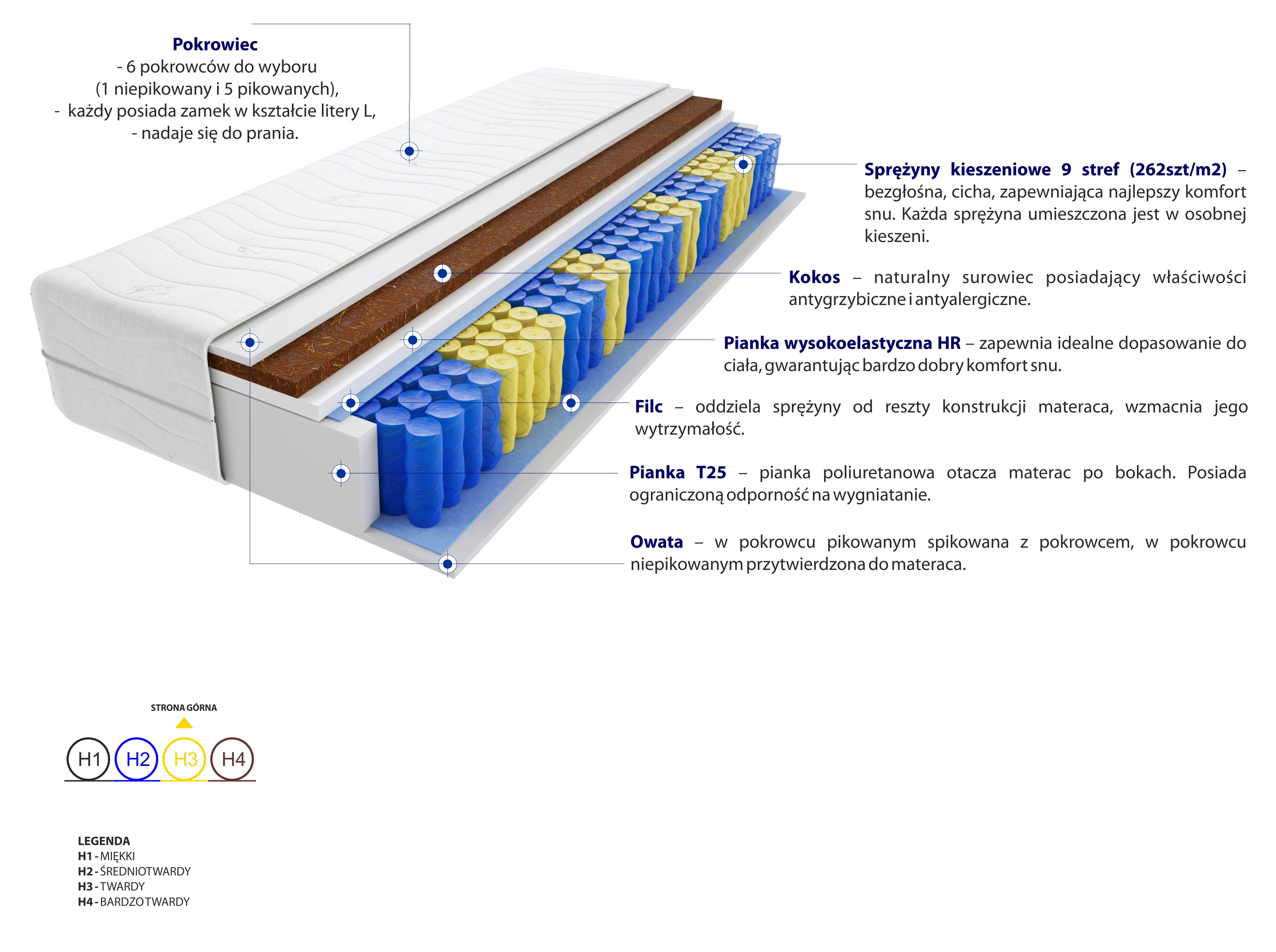 Filc, Kokos, Pianka T25, Pianka wysokoelastyczna HR, Pokrowiec, Sprężyny kieszeniowe, Włókno klimatyzujące
