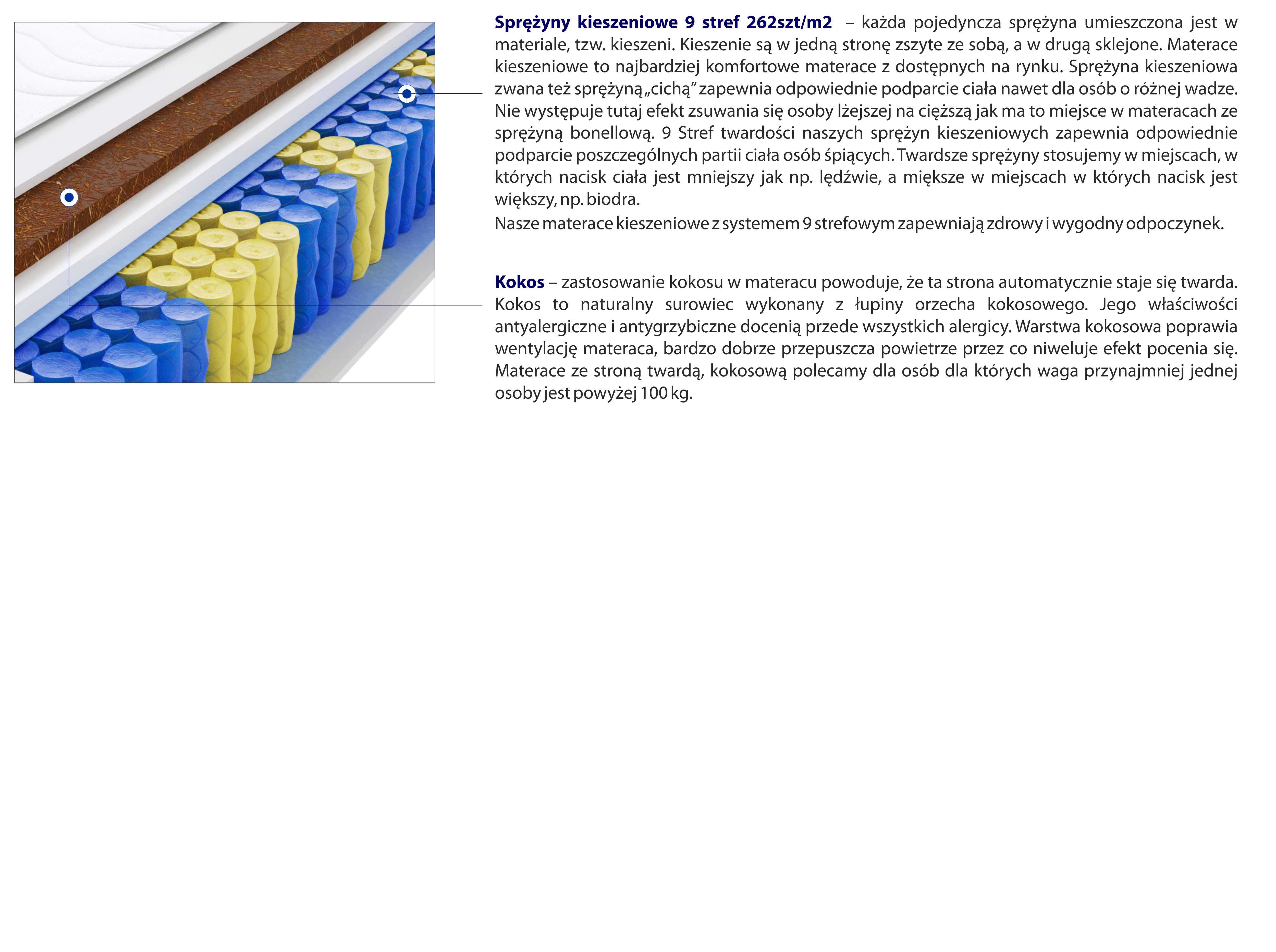– każda pojedyncza sprężyna umieszczona jest w materiale, tzw. kieszeni. Kieszenie są w jedną stronę zszyte ze sobą, a w drugą sklejone. Materace kieszeniowe to najbardziej komfortowe materace z dostępnych na rynku. Sprężyna kieszeniowa zwana też sprężyną „cichą” zapewnia odpowiednie podparcie ciała nawet dla osób o różnej wadze. Nie występuje tutaj efekt zsuwania się osoby lżejszej na cięższą jak ma to miejsce w materacach ze sprężyną bonellową. 9 Stref twardości naszych sprężyn kieszeniowych zapewnia odpowiednie podparcie poszczególnych partii ciała osób śpiących. Twardsze sprężyny stosujemy w miejscach, w których nacisk ciała jest mniejszy jak np. lędźwie, a miększe w miejscach w których nacisk jest większy, np. biodra.