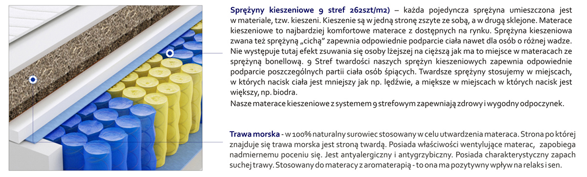 – każda pojedyncza sprężyna umieszczona jest w materiale, tzw. kieszeni. Kieszenie są w jedną stronę zszyte ze sobą, a w drugą sklejone. Materace kieszeniowe to najbardziej komfortowe materace z dostępnych na rynku. Sprężyna kieszeniowa zwana też sprężyną „cichą” zapewnia odpowiednie podparcie ciała nawet dla osób o różnej wadze. Nie występuje tutaj efekt zsuwania się osoby lżejszej na cięższą jak ma to miejsce w materacach ze sprężyną bonellową. 9 Stref twardości naszych sprężyn kieszeniowych zapewnia odpowiednie podparcie poszczególnych partii ciała osób śpiących. Twardsze sprężyny stosujemy w miejscach, w których nacisk ciała jest mniejszy jak np. lędźwie, a miększe w miejscach w których nacisk jest większy, np. biodra.