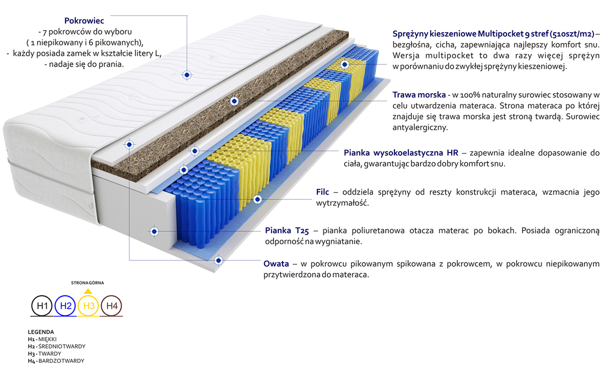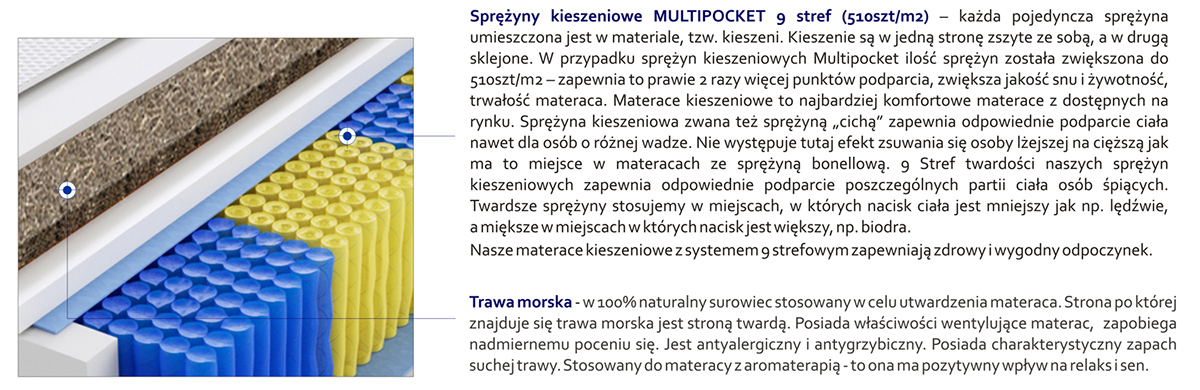 – każda pojedyncza sprężyna umieszczona jest w materiale, tzw. kieszeni. Kieszenie są w jedną stronę zszyte ze sobą, a w drugą sklejone. W przypadku sprężyn kieszeniowych Multipocket ilość sprężyn została zwiększona do 510szt/m2 – zapewnia to prawie 2 razy więcej punktów podparcia, zwiększa jakość snu i żywotność, trwałość materaca. Materace kieszeniowe to najbardziej komfortowe materace z dostępnych na rynku. Sprężyna kieszeniowa zwana też sprężyną „cichą” zapewnia odpowiednie podparcie ciała nawet dla osób o różnej wadze. Nie występuje tutaj efekt zsuwania się osoby lżejszej na cięższą jak ma to miejsce w materacach ze sprężyną bonellową. 9 Stref twardości naszych sprężyn kieszeniowych zapewnia odpowiednie podparcie poszczególnych partii ciała osób śpiących. Twardsze sprężyny stosujemy w miejscach, w których nacisk ciała jest mniejszy jak np. lędźwie, a miększe w miejscach w których nacisk jest większy, np. biodra.