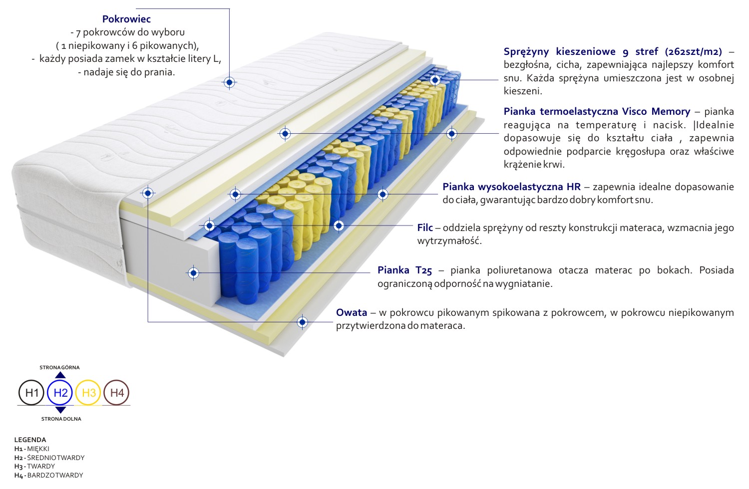 2x Pianka Visco Memory, Filc, Pianka T25, Pianka wysokoelastyczna HR, Pokrowiec, Sprężyny kieszeniowe, Włókno klimatyzujące