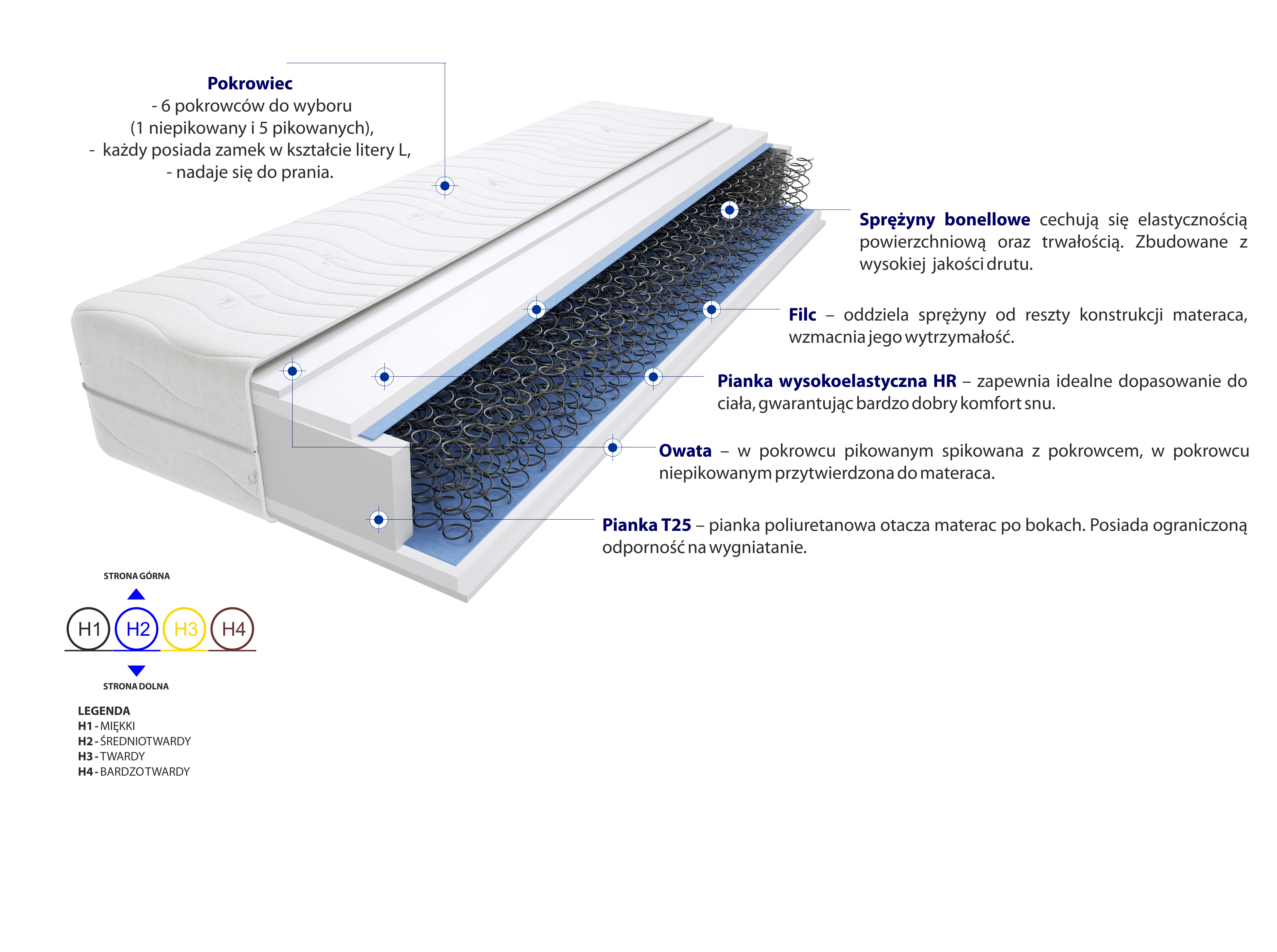 Filc, Pianka T25, Pianka wysokoelastyczna HR, Pokrowiec, Sprężyny bonellowe, Włókno klimatyzujące