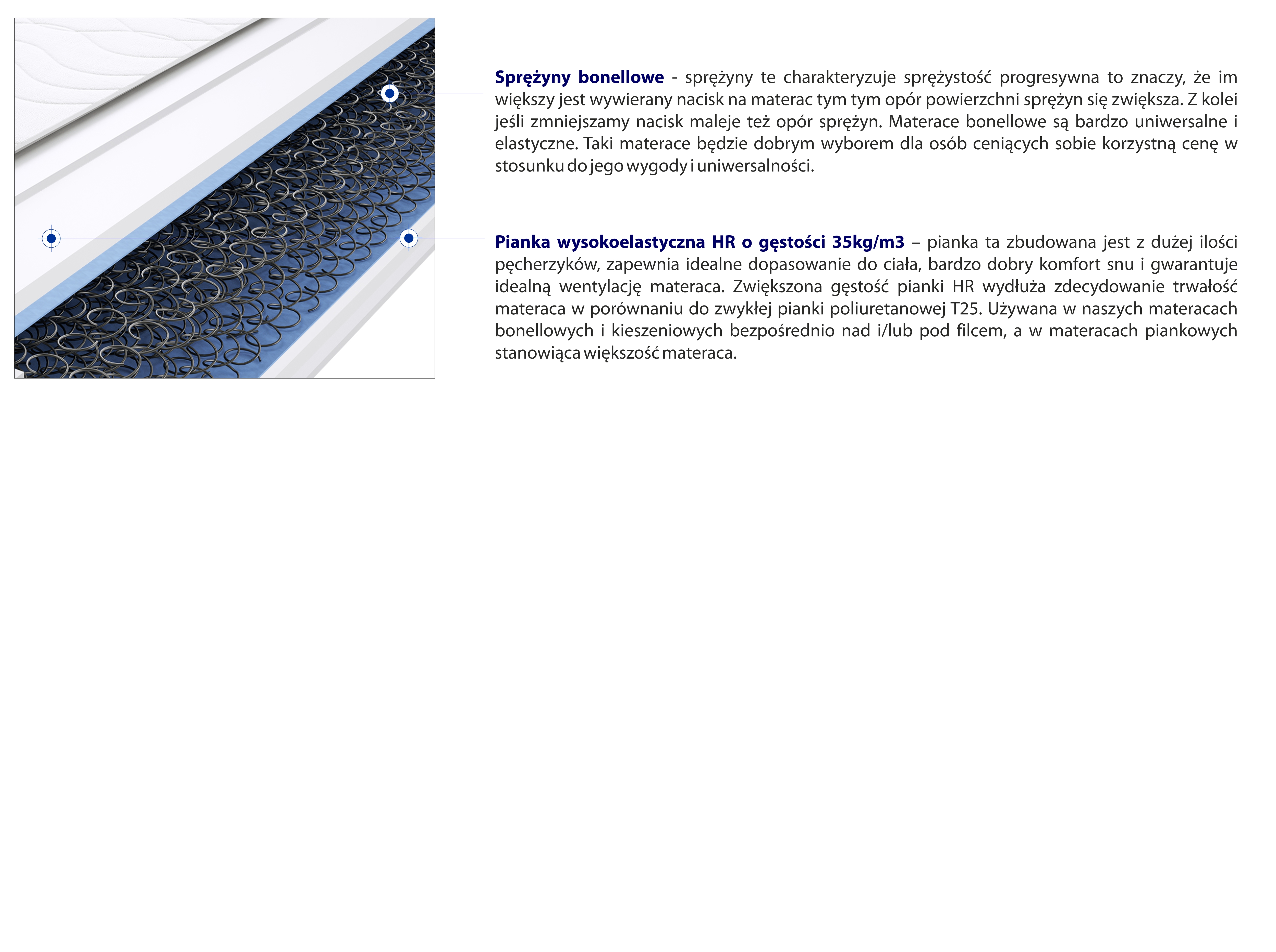 o gęstości 35kg/m3 – pianka ta zbudowana jest z dużej ilości pęcherzyków, zapewnia idealne dopasowanie do ciała, bardzo dobry komfort snu i gwarantuje idealną wentylację materaca. Zwiększona gęstość pianki HR wydłuża zdecydowanie trwałość materaca w porównaniu do zwykłej pianki poliuretanowej T25. Używana w naszych materacach bonellowych i kieszeniowych bezpośrednio nad i/lub pod filcem, a w materacach piankowych stanowiąca większość materaca.