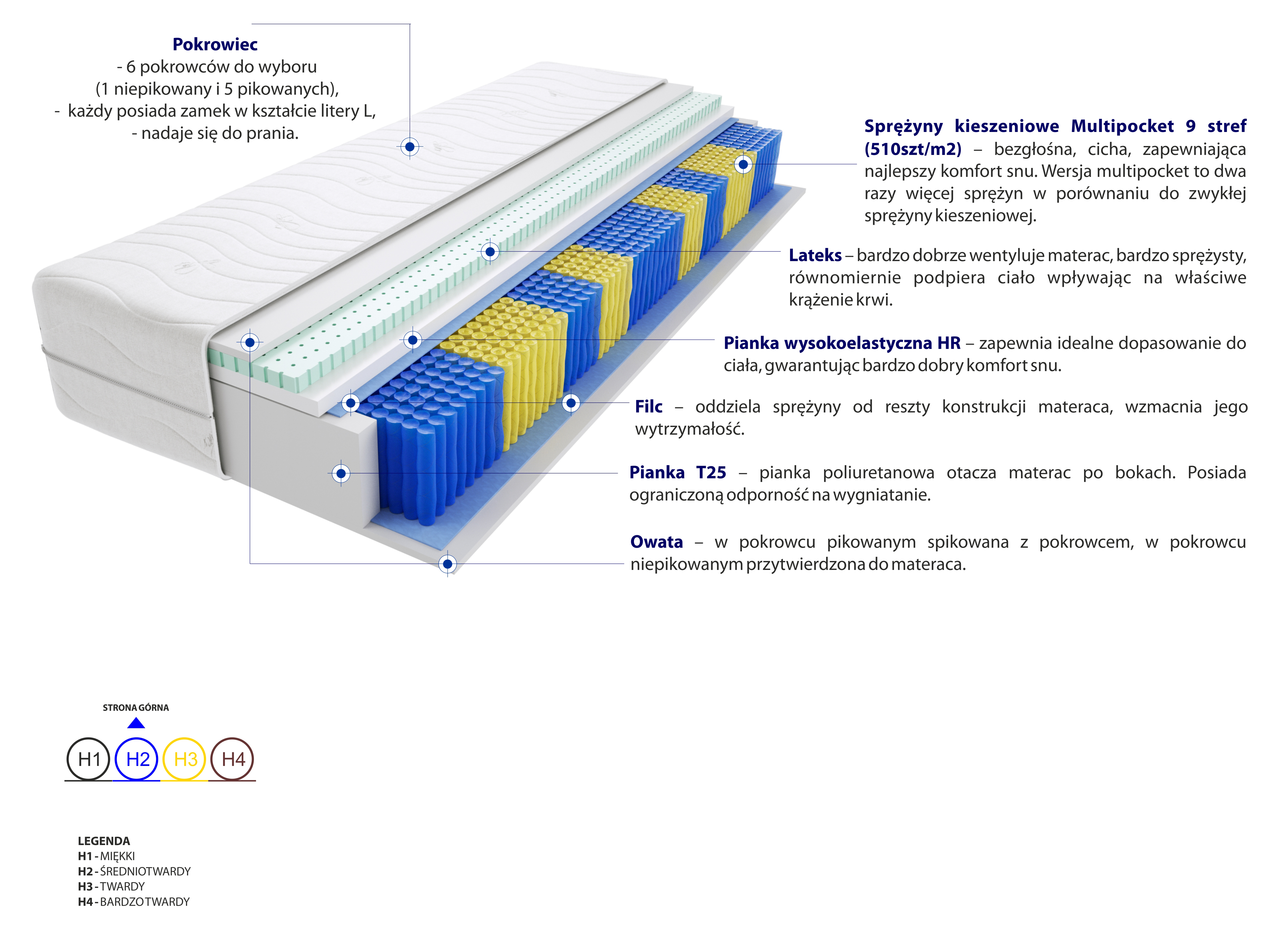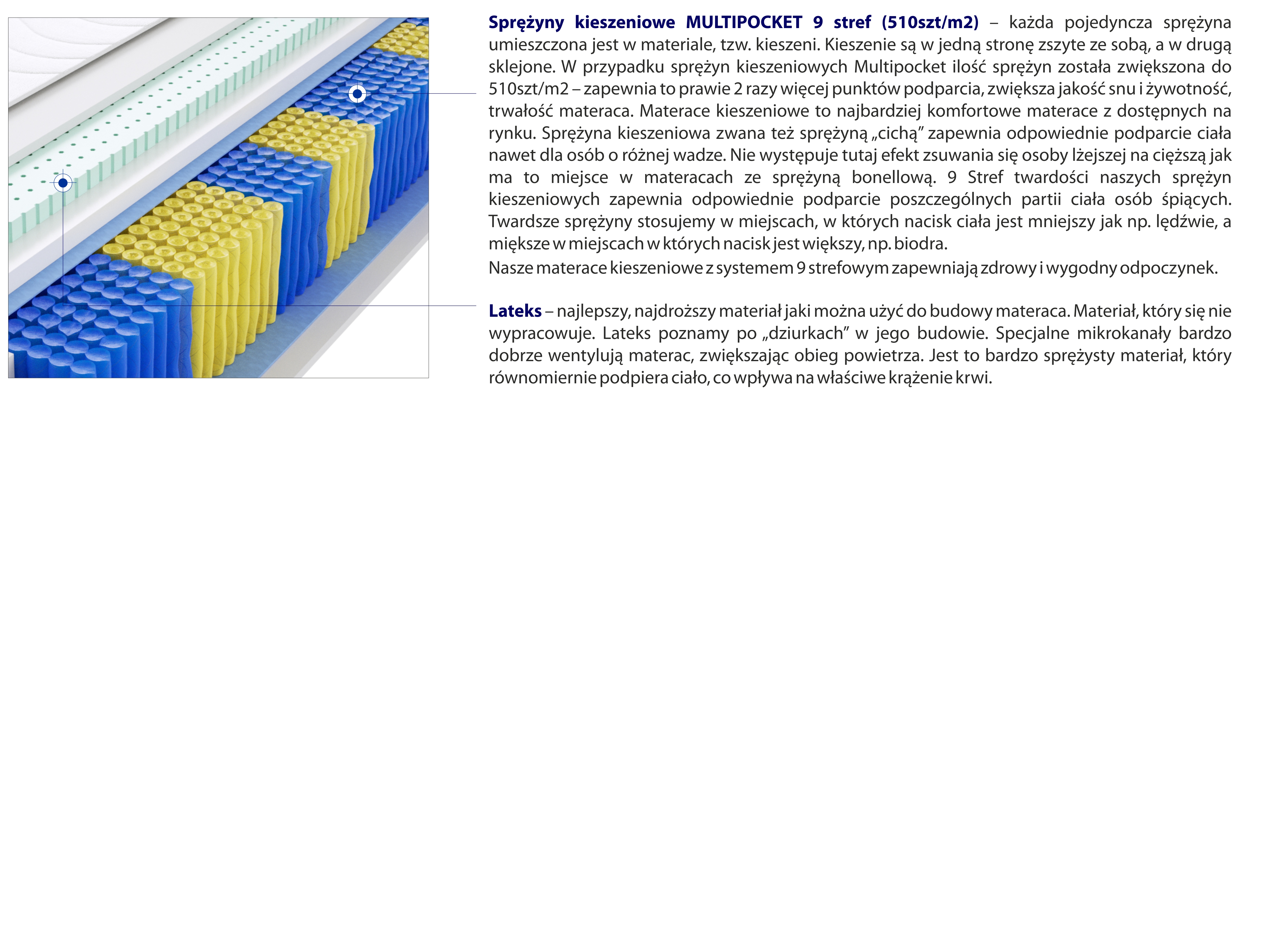 – każda pojedyncza sprężyna umieszczona jest w materiale, tzw. kieszeni. Kieszenie są w jedną stronę zszyte ze sobą, a w drugą sklejone. W przypadku sprężyn kieszeniowych Multipocket ilość sprężyn została zwiększona do 510szt/m2 – zapewnia to prawie 2 razy więcej punktów podparcia, zwiększa jakość snu i żywotność, trwałość materaca. Materace kieszeniowe to najbardziej komfortowe materace z dostępnych na rynku. Sprężyna kieszeniowa zwana też sprężyną „cichą” zapewnia odpowiednie podparcie ciała nawet dla osób o różnej wadze. Nie występuje tutaj efekt zsuwania się osoby lżejszej na cięższą jak ma to miejsce w materacach ze sprężyną bonellową. 9 Stref twardości naszych sprężyn kieszeniowych zapewnia odpowiednie podparcie poszczególnych partii ciała osób śpiących. Twardsze sprężyny stosujemy w miejscach, w których nacisk ciała jest mniejszy jak np. lędźwie, a miększe w miejscach w których nacisk jest większy, np. biodra.
