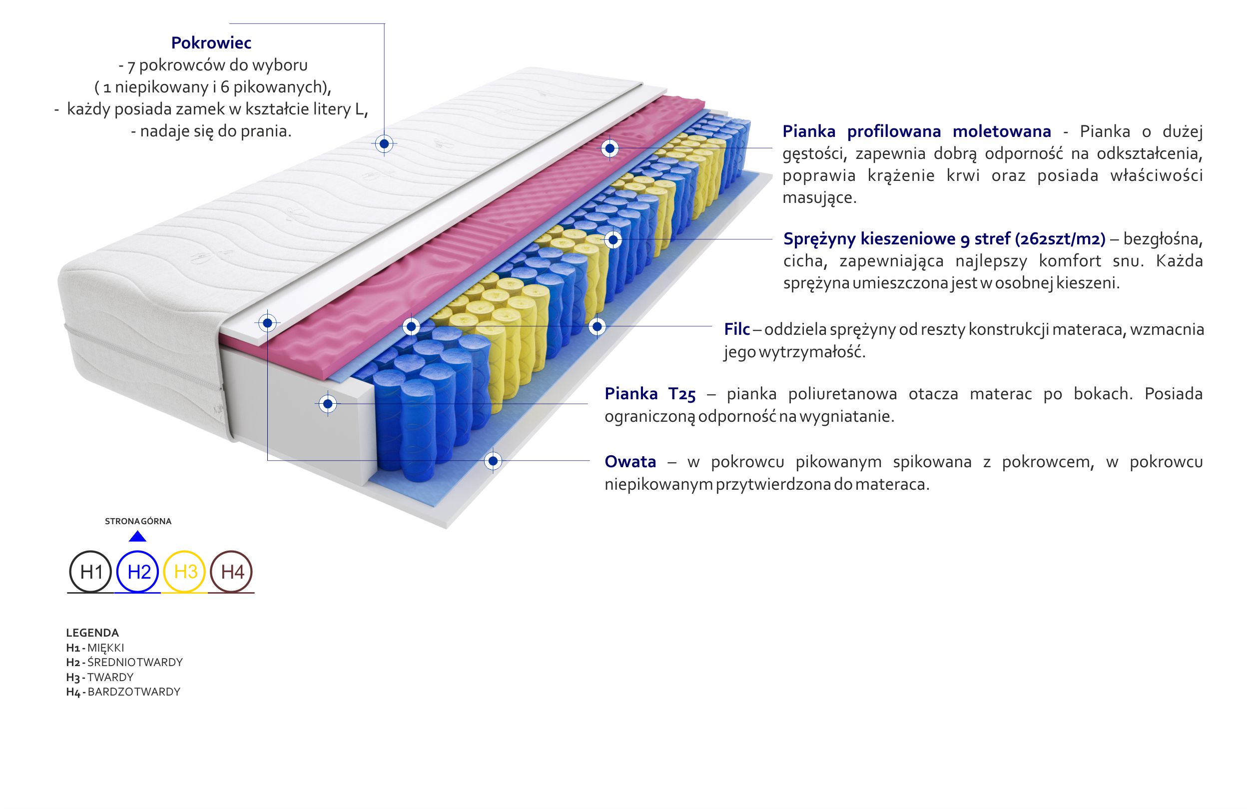 Filc, Pianka profilowana molet, Pianka T25, Pianka wysokoelastyczna HR, Pokrowiec, Sprężyny kieszeniowe, Włókno klimatyzujące