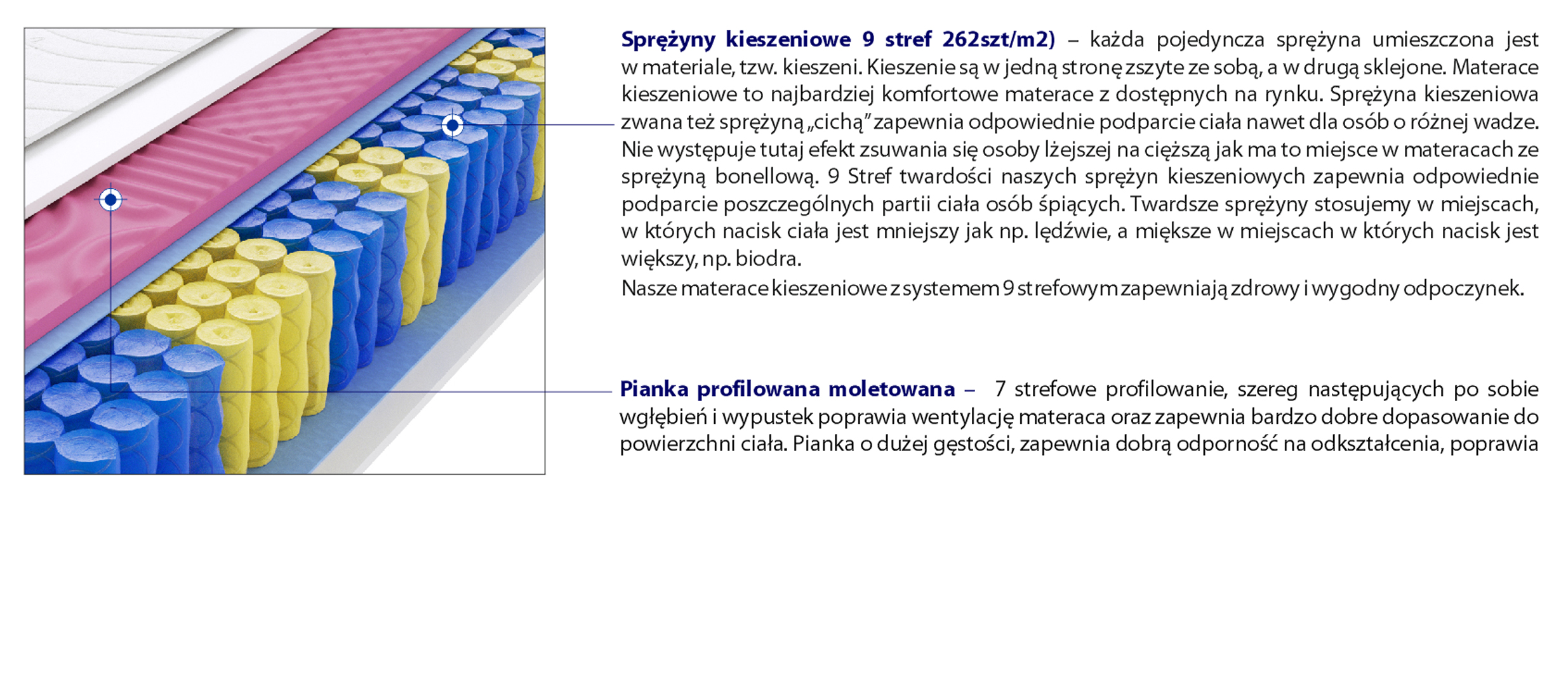 – każda pojedyncza sprężyna umieszczona jest w materiale, tzw. kieszeni. Kieszenie są w jedną stronę zszyte ze sobą, a w drugą sklejone. Materace kieszeniowe to najbardziej komfortowe materace z dostępnych na rynku. Sprężyna kieszeniowa zwana też sprężyną „cichą” zapewnia odpowiednie podparcie ciała nawet dla osób o różnej wadze. Nie występuje tutaj efekt zsuwania się osoby lżejszej na cięższą jak ma to miejsce w materacach ze sprężyną bonellową. 9 Stref twardości naszych sprężyn kieszeniowych zapewnia odpowiednie podparcie poszczególnych partii ciała osób śpiących. Twardsze sprężyny stosujemy w miejscach, w których nacisk ciała jest mniejszy jak np. lędźwie, a miększe w miejscach w których nacisk jest większy, np. biodra.