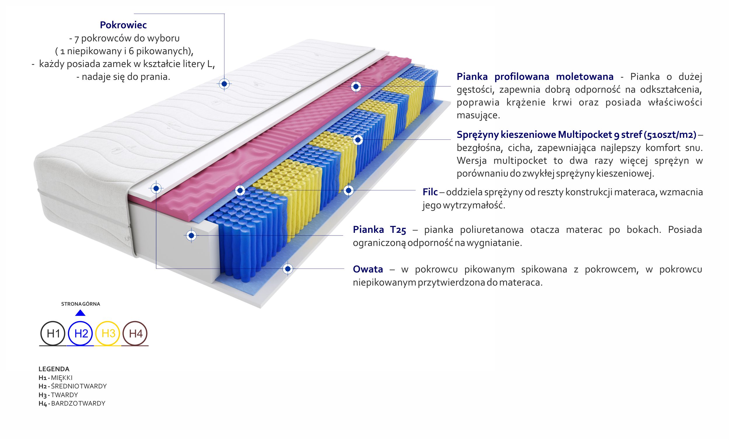 Filc, Pianka profilowana molet, Pianka T25, Pokrowiec, Sprężyny kieszeniowe Multipocket, Włókno klimatyzujące