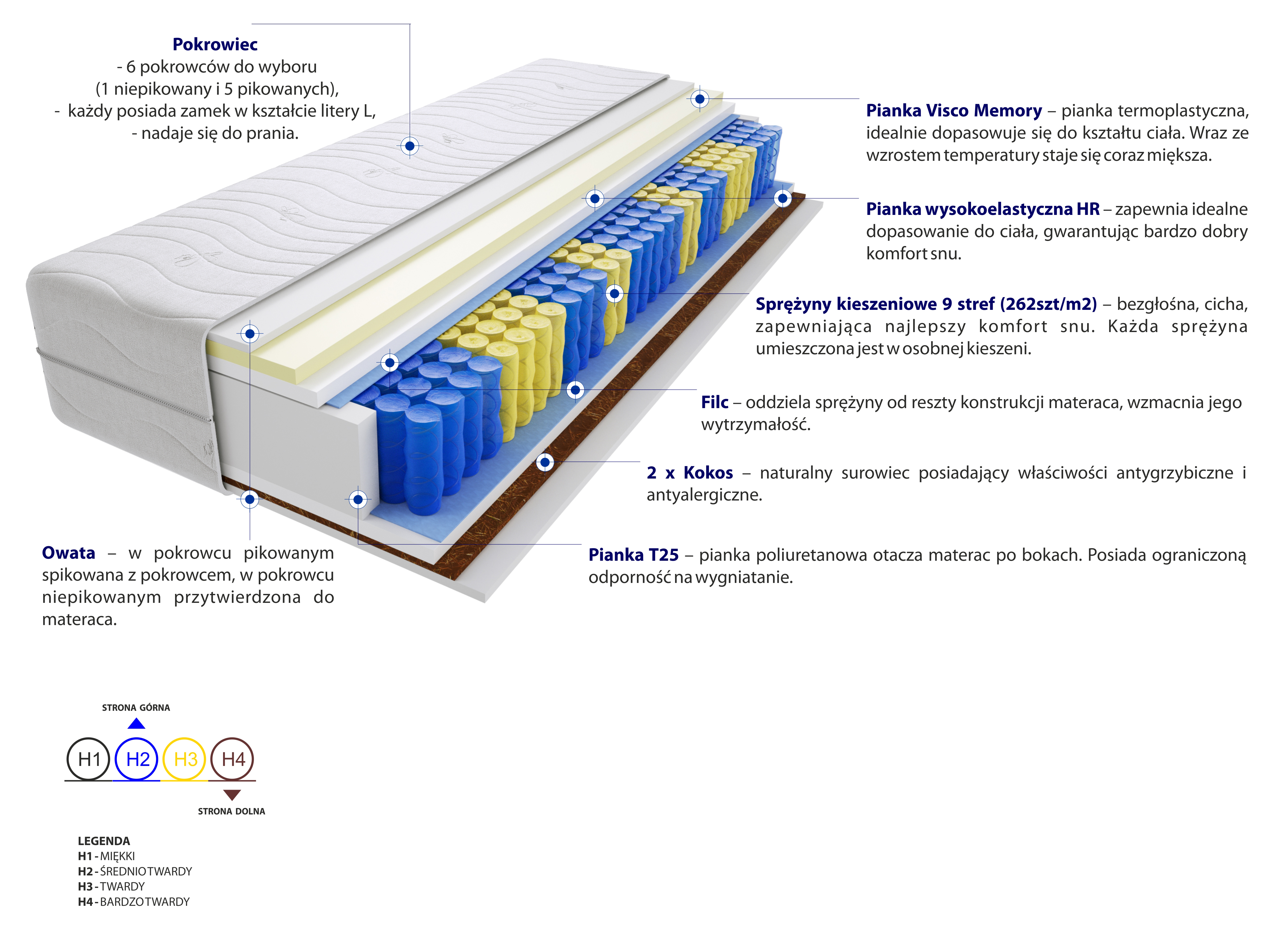 2x Kokos, Filc, Pianka T25, Pianka Visco Memory, Pianka wysokoelastyczna HR, Pokrowiec, Sprężyny kieszeniowe, Włókno klimatyzujące