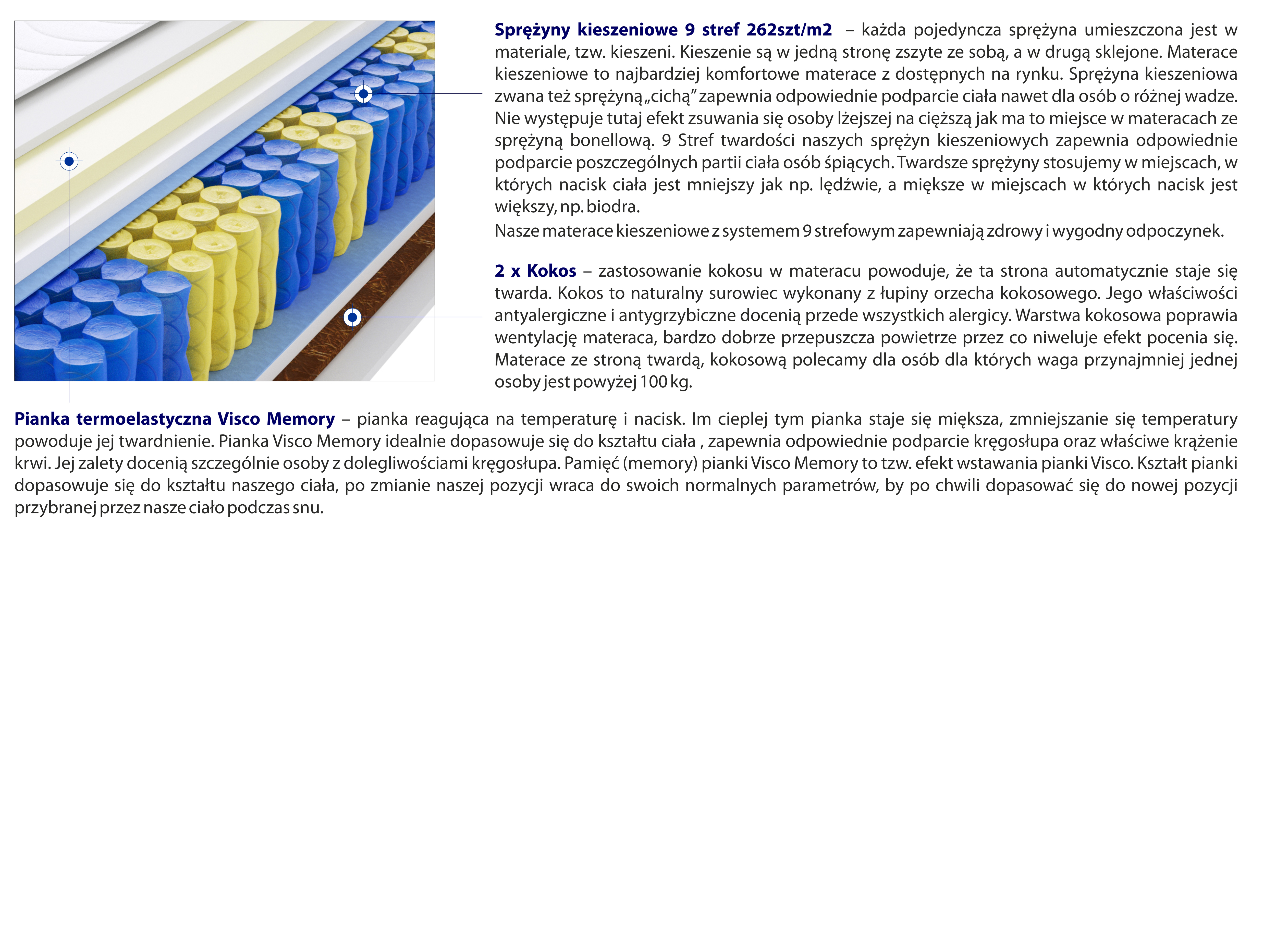 – każda pojedyncza sprężyna umieszczona jest w materiale, tzw. kieszeni. Kieszenie są w jedną stronę zszyte ze sobą, a w drugą sklejone. Materace kieszeniowe to najbardziej komfortowe materace z dostępnych na rynku. Sprężyna kieszeniowa zwana też sprężyną „cichą” zapewnia odpowiednie podparcie ciała nawet dla osób o różnej wadze. Nie występuje tutaj efekt zsuwania się osoby lżejszej na cięższą jak ma to miejsce w materacach ze sprężyną bonellową. 9 Stref twardości naszych sprężyn kieszeniowych zapewnia odpowiednie podparcie poszczególnych partii ciała osób śpiących. Twardsze sprężyny stosujemy w miejscach, w których nacisk ciała jest mniejszy jak np. lędźwie, a miększe w miejscach w których nacisk jest większy, np. biodra.