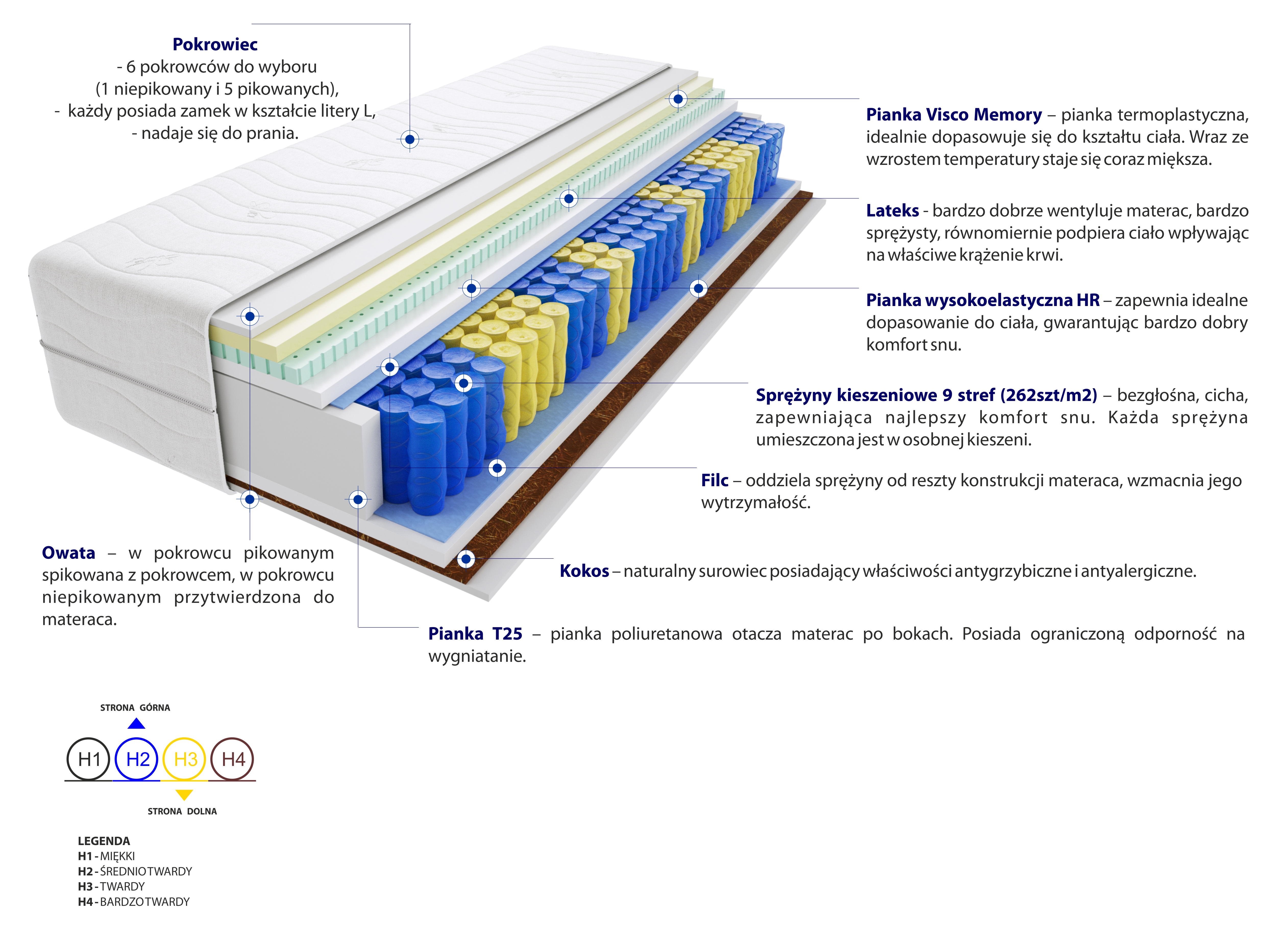 Filc, Kokos, Lateks, Pianka T25, Pianka Visco Memory, Pianka wysokoelastyczna HR, Pokrowiec, Sprężyny kieszeniowe, Włókno klimatyzujące