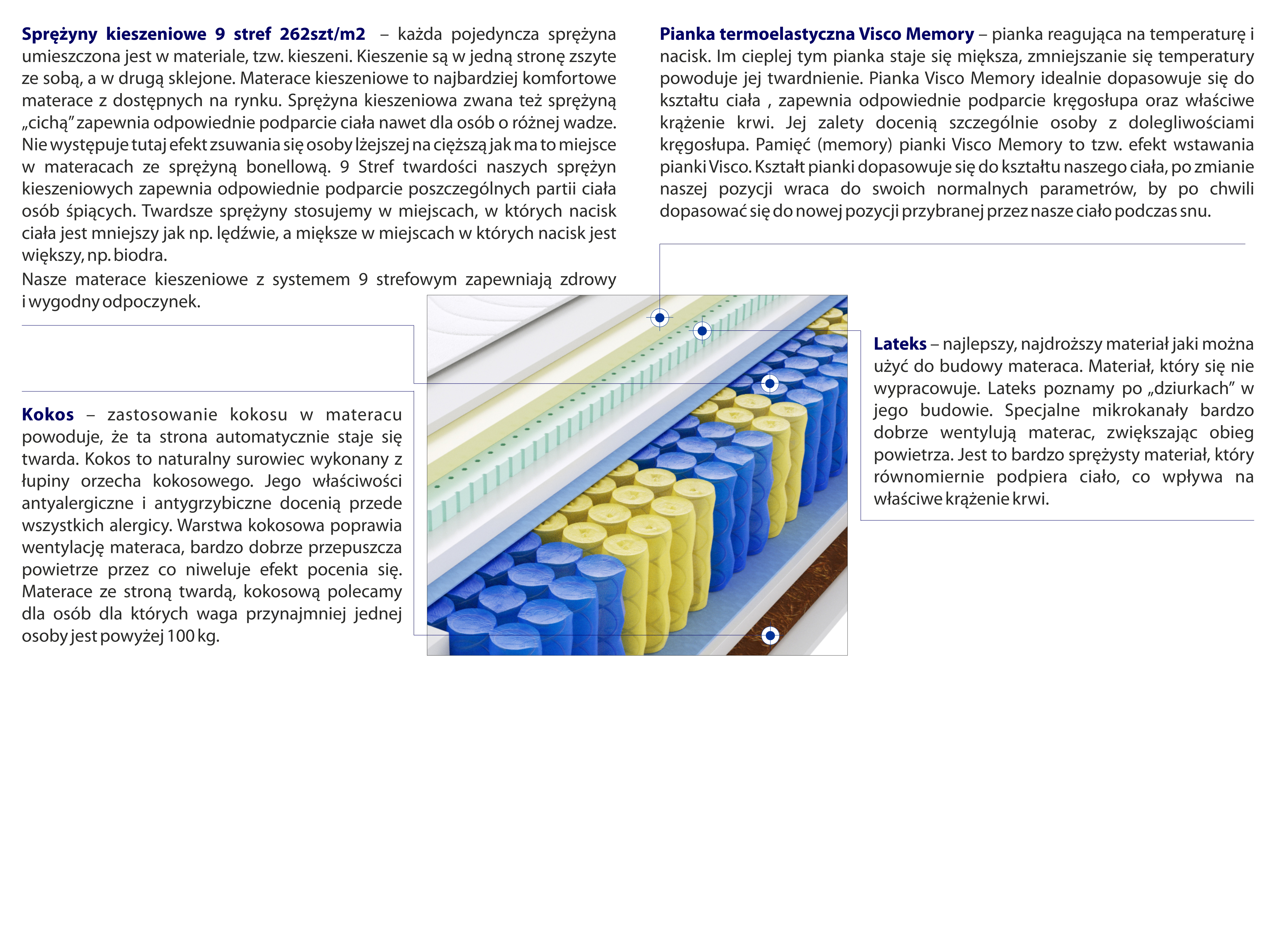 – każda pojedyncza sprężyna umieszczona jest w materiale, tzw. kieszeni. Kieszenie są w jedną stronę zszyte ze sobą, a w drugą sklejone. Materace kieszeniowe to najbardziej komfortowe materace z dostępnych na rynku. Sprężyna kieszeniowa zwana też sprężyną „cichą” zapewnia odpowiednie podparcie ciała nawet dla osób o różnej wadze. Nie występuje tutaj efekt zsuwania się osoby lżejszej na cięższą jak ma to miejsce w materacach ze sprężyną bonellową. 9 Stref twardości naszych sprężyn kieszeniowych zapewnia odpowiednie podparcie poszczególnych partii ciała osób śpiących. Twardsze sprężyny stosujemy w miejscach, w których nacisk ciała jest mniejszy jak np. lędźwie, a miększe w miejscach w których nacisk jest większy, np. biodra.
