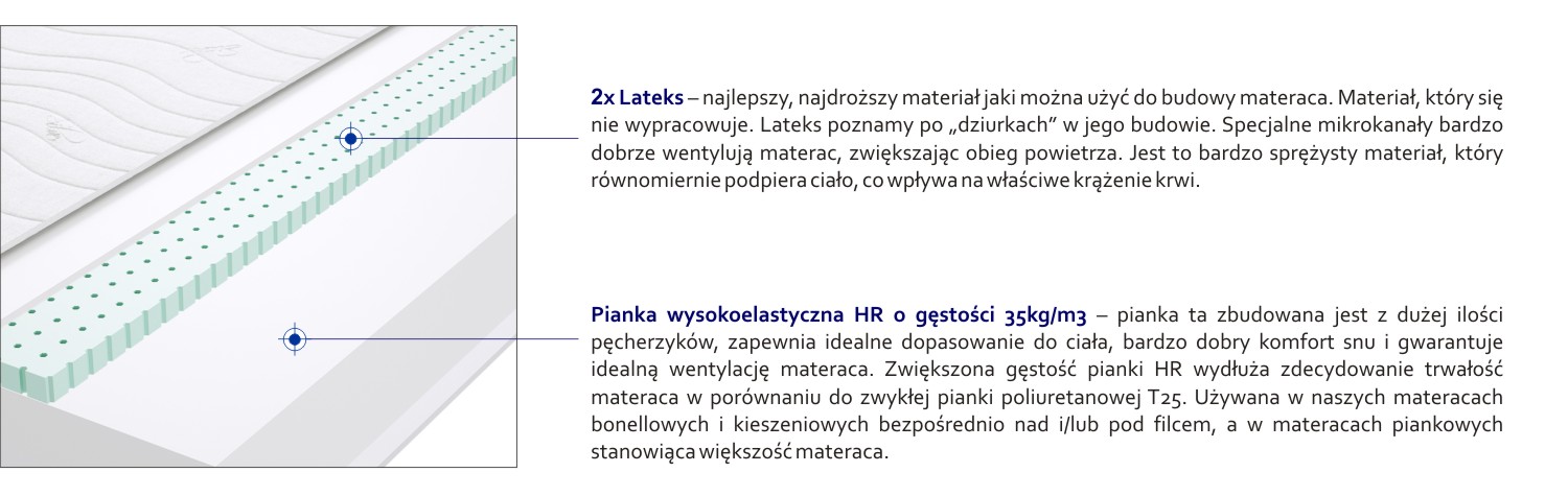 – najlepszy, najdroższy materiał jaki można użyć do budowy materaca. Materiał, który się nie wypracowuje. Lateks poznamy po „dziurkach” w jego budowie. Specjalne mikrokanały bardzo dobrze wentylują materac, zwiększając obieg powietrza. Jest to bardzo sprężysty materiał, który równomiernie podpiera ciało, co wpływa na właściwe krążenie krwi.