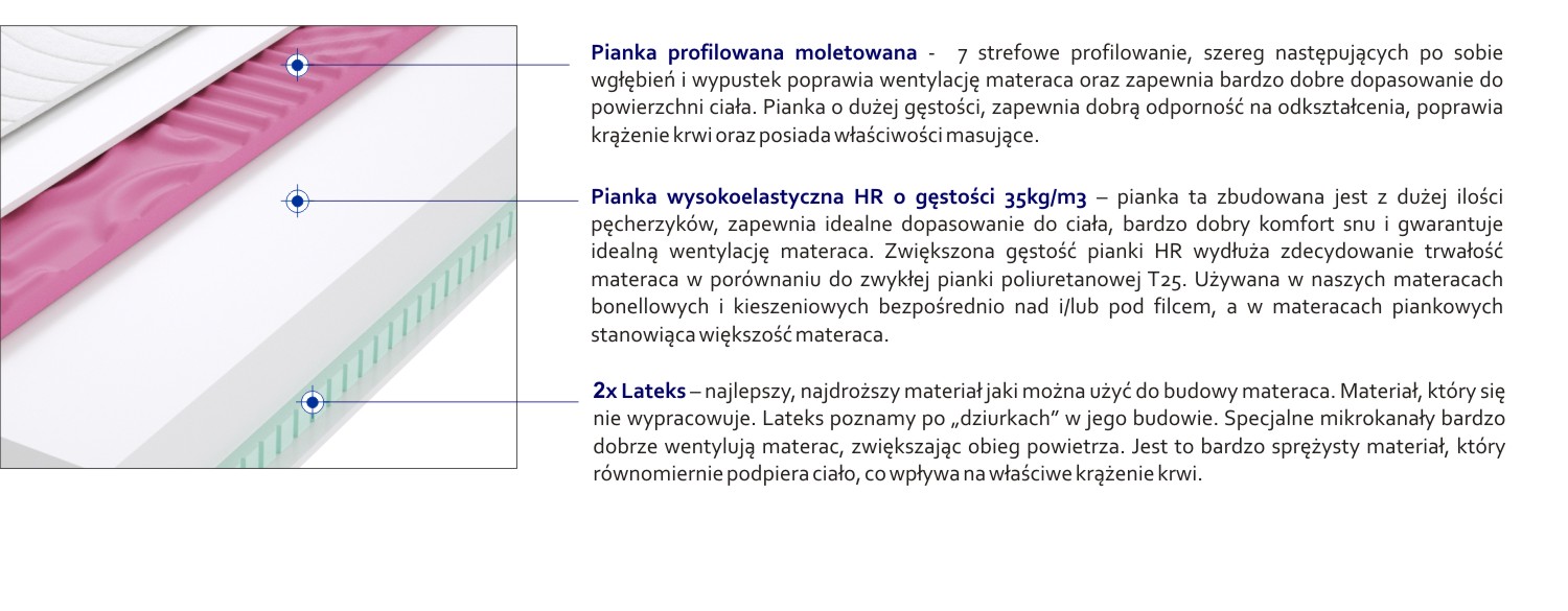 2x Lateks, Pianka profilowana molet, Pianka wysokoelastyczna HR, Pokrowiec, Włókno klimatyzujące