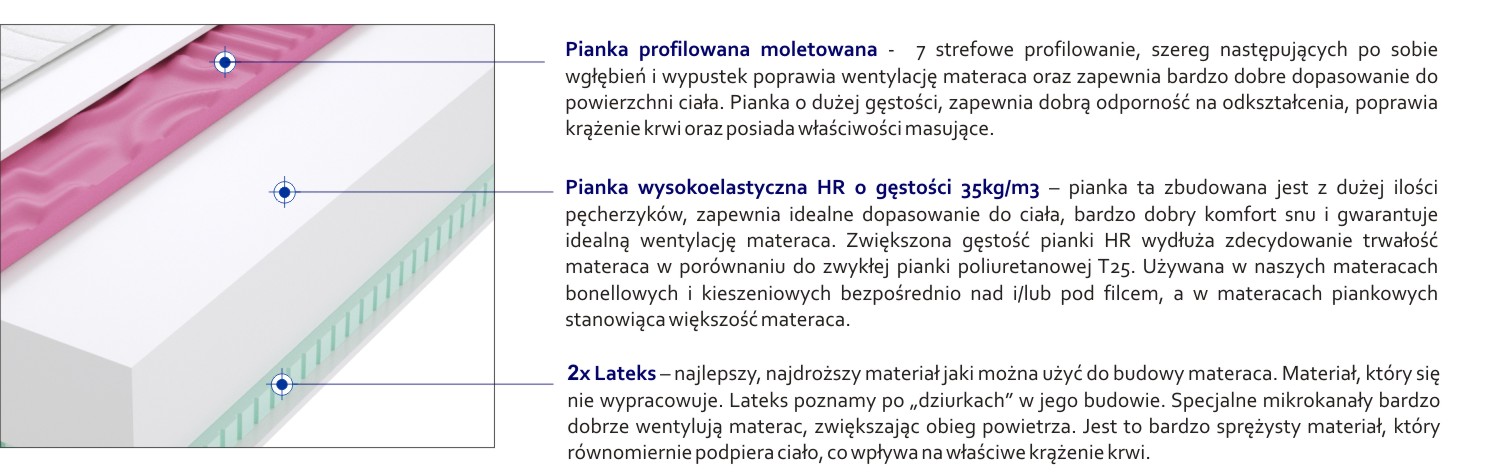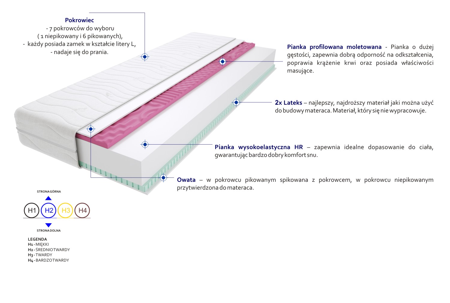 2x Lateks, Pianka profilowana molet, Pianka wysokoelastyczna HR, Pokrowiec, Włókno klimatyzujące
