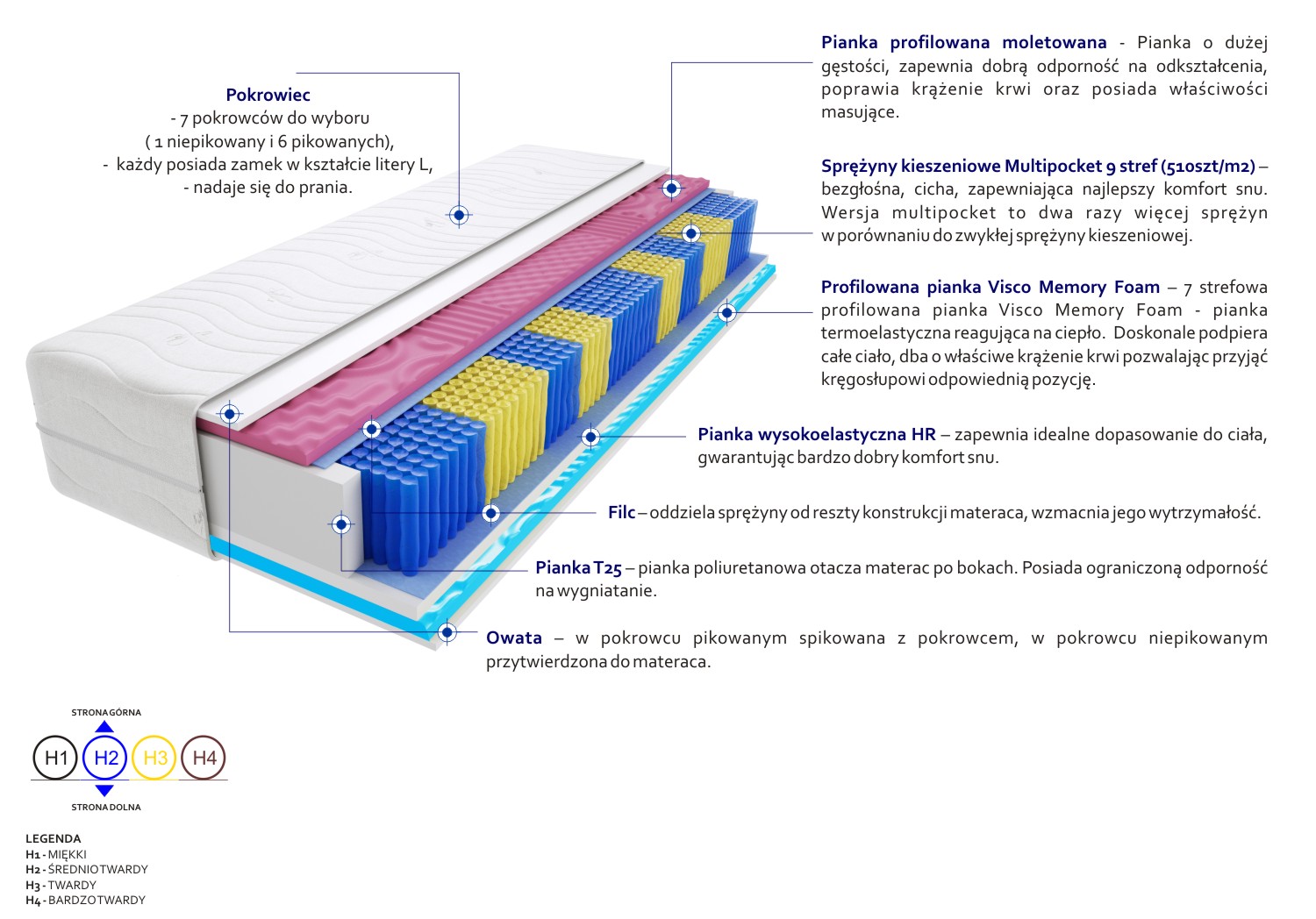 Filc, Pianka profilowana molet, Pianka profilowana Visco Memory, Pianka T25, Pianka wysokoelastyczna HR, Pokrowiec, Sprężyny kieszeniowe Multipocket, Włókno klimatyzujące