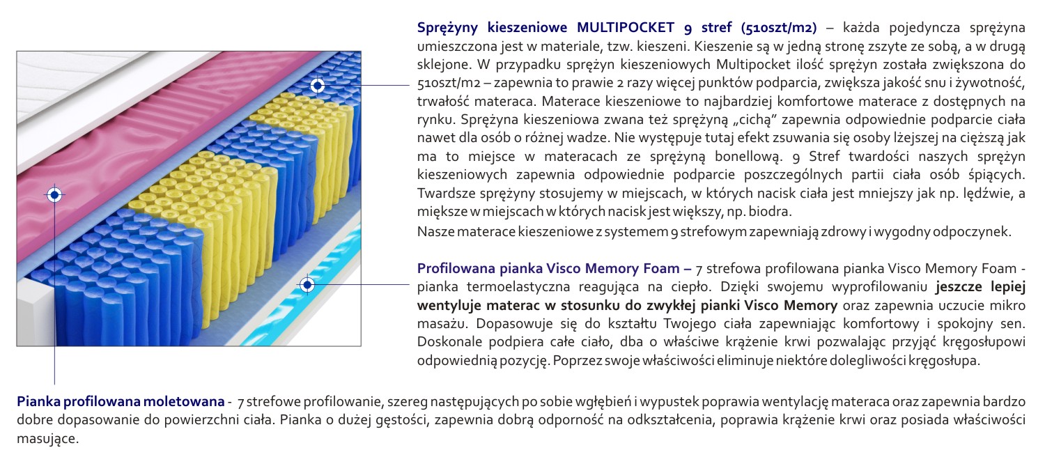 – każda pojedyncza sprężyna umieszczona jest w materiale, tzw. kieszeni. Kieszenie są w jedną stronę zszyte ze sobą, a w drugą sklejone. W przypadku sprężyn kieszeniowych Multipocket ilość sprężyn została zwiększona do 510szt/m2 – zapewnia to prawie 2 razy więcej punktów podparcia, zwiększa jakość snu i żywotność, trwałość materaca. Materace kieszeniowe to najbardziej komfortowe materace z dostępnych na rynku. Sprężyna kieszeniowa zwana też sprężyną „cichą” zapewnia odpowiednie podparcie ciała nawet dla osób o różnej wadze. Nie występuje tutaj efekt zsuwania się osoby lżejszej na cięższą jak ma to miejsce w materacach ze sprężyną bonellową. 9 Stref twardości naszych sprężyn kieszeniowych zapewnia odpowiednie podparcie poszczególnych partii ciała osób śpiących. Twardsze sprężyny stosujemy w miejscach, w których nacisk ciała jest mniejszy jak np. lędźwie, a miększe w miejscach w których nacisk jest większy, np. biodra. Nasze materace kieszeniowe z systemem 9 strefowym zapewniają zdrowy i wygodny odpoczynek.