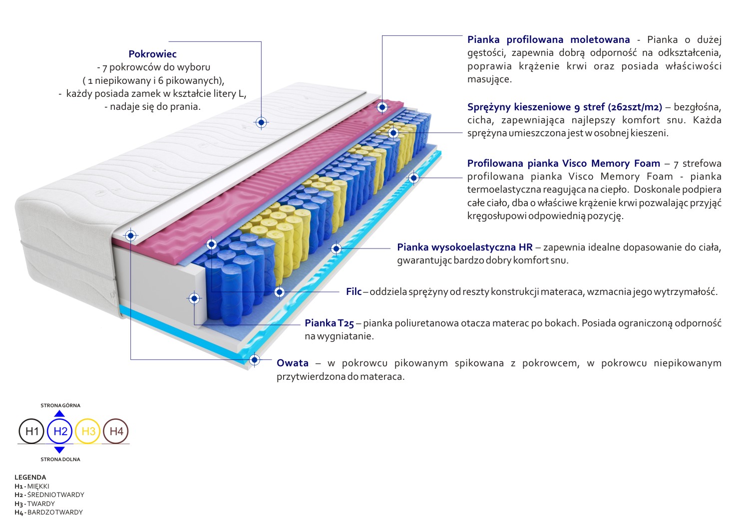 Filc, Pianka profilowana molet, Pianka profilowana Visco Memory, Pianka T25, Pianka wysokoelastyczna HR, Pokrowiec, Sprężyny kieszeniowe, Włókno klimatyzujące