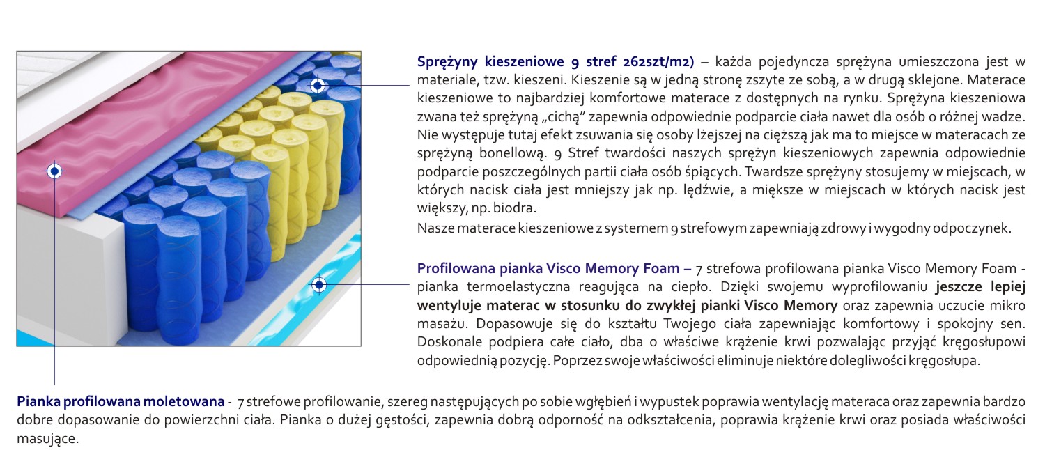 – każda pojedyncza sprężyna umieszczona jest w materiale, tzw. kieszeni. Kieszenie są w jedną stronę zszyte ze sobą, a w drugą sklejone. Materace kieszeniowe to najbardziej komfortowe materace z dostępnych na rynku. Sprężyna kieszeniowa zwana też sprężyną „cichą” zapewnia odpowiednie podparcie ciała nawet dla osób o różnej wadze. Nie występuje tutaj efekt zsuwania się osoby lżejszej na cięższą jak ma to miejsce w materacach ze sprężyną bonellową. 9 Stref twardości naszych sprężyn kieszeniowych zapewnia odpowiednie podparcie poszczególnych partii ciała osób śpiących. Twardsze sprężyny stosujemy w miejscach, w których nacisk ciała jest mniejszy jak np. lędźwie, a miększe w miejscach w których nacisk jest większy, np. biodra.