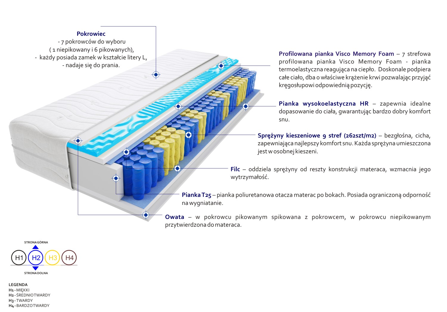 Filc, Pianka profilowana Visco Memory, Pianka T25, Pianka wysokoelastyczna HR, Pokrowiec, Sprężyny kieszeniowe, Włókno klimatyzujące