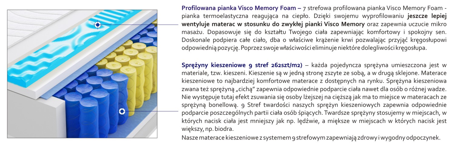 – każda pojedyncza sprężyna umieszczona jest w materiale, tzw. kieszeni. Kieszenie są w jedną stronę zszyte ze sobą, a w drugą sklejone. Materace kieszeniowe to najbardziej komfortowe materace z dostępnych na rynku. Sprężyna kieszeniowa zwana też sprężyną „cichą” zapewnia odpowiednie podparcie ciała nawet dla osób o różnej wadze. Nie występuje tutaj efekt zsuwania się osoby lżejszej na cięższą jak ma to miejsce w materacach ze sprężyną bonellową. 9 Stref twardości naszych sprężyn kieszeniowych zapewnia odpowiednie podparcie poszczególnych partii ciała osób śpiących. Twardsze sprężyny stosujemy w miejscach, w których nacisk ciała jest mniejszy jak np. lędźwie, a miększe w miejscach w których nacisk jest większy, np. biodra.