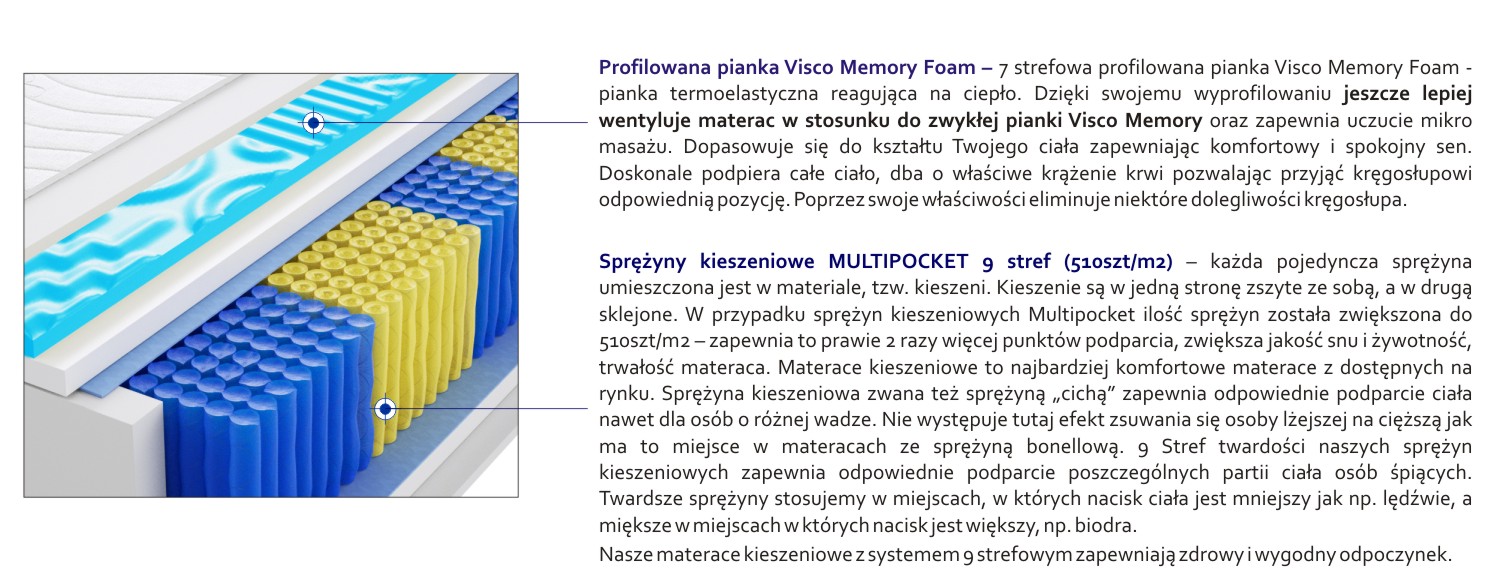 – każda pojedyncza sprężyna umieszczona jest w materiale, tzw. kieszeni. Kieszenie są w jedną stronę zszyte ze sobą, a w drugą sklejone. W przypadku sprężyn kieszeniowych Multipocket ilość sprężyn została zwiększona do 510szt/m2 – zapewnia to prawie 2 razy więcej punktów podparcia, zwiększa jakość snu i żywotność, trwałość materaca. Materace kieszeniowe to najbardziej komfortowe materace z dostępnych na rynku. Sprężyna kieszeniowa zwana też sprężyną „cichą” zapewnia odpowiednie podparcie ciała nawet dla osób o różnej wadze. Nie występuje tutaj efekt zsuwania się osoby lżejszej na cięższą jak ma to miejsce w materacach ze sprężyną bonellową. 9 Stref twardości naszych sprężyn kieszeniowych zapewnia odpowiednie podparcie poszczególnych partii ciała osób śpiących. Twardsze sprężyny stosujemy w miejscach, w których nacisk ciała jest mniejszy jak np. lędźwie, a miększe w miejscach w których nacisk jest większy, np. biodra. Nasze materace kieszeniowe z systemem 9 strefowym zapewniają zdrowy i wygodny odpoczynek.
